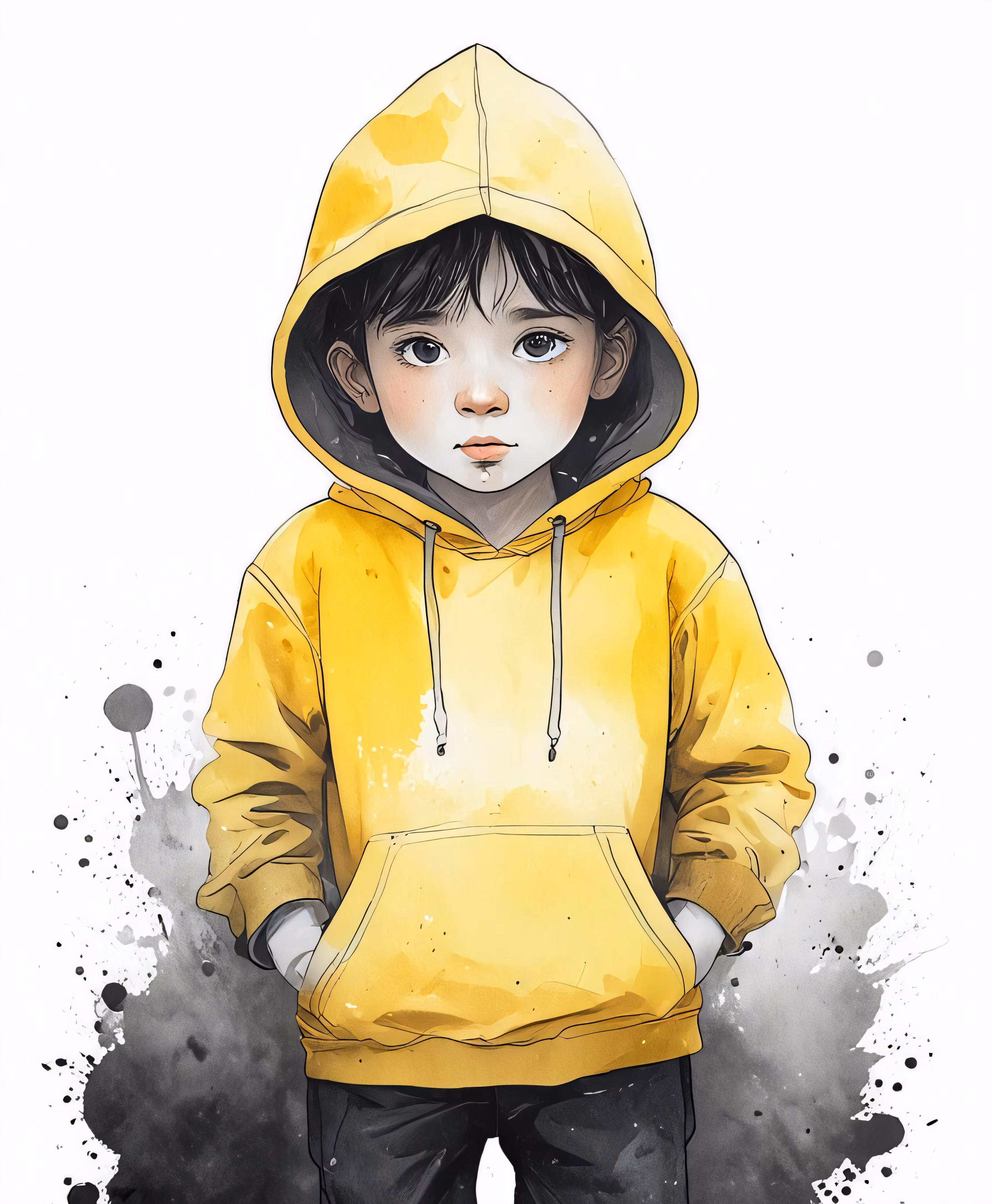 High resolution picture, free to use, a little kid in a yellow hoodie, with his hands on his hips