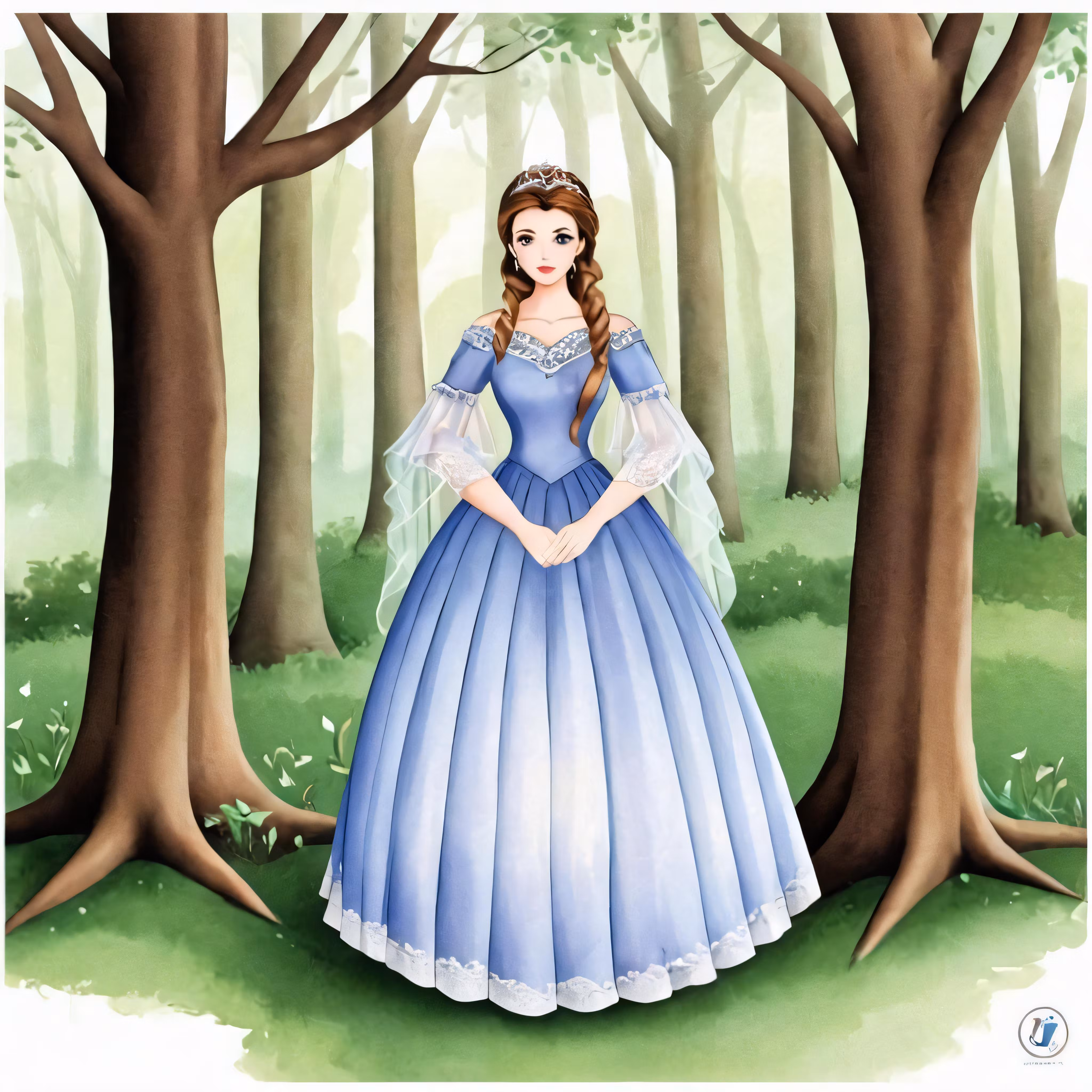 High resolution picture, free to use, a little princess in a blue dress standing next to a tree