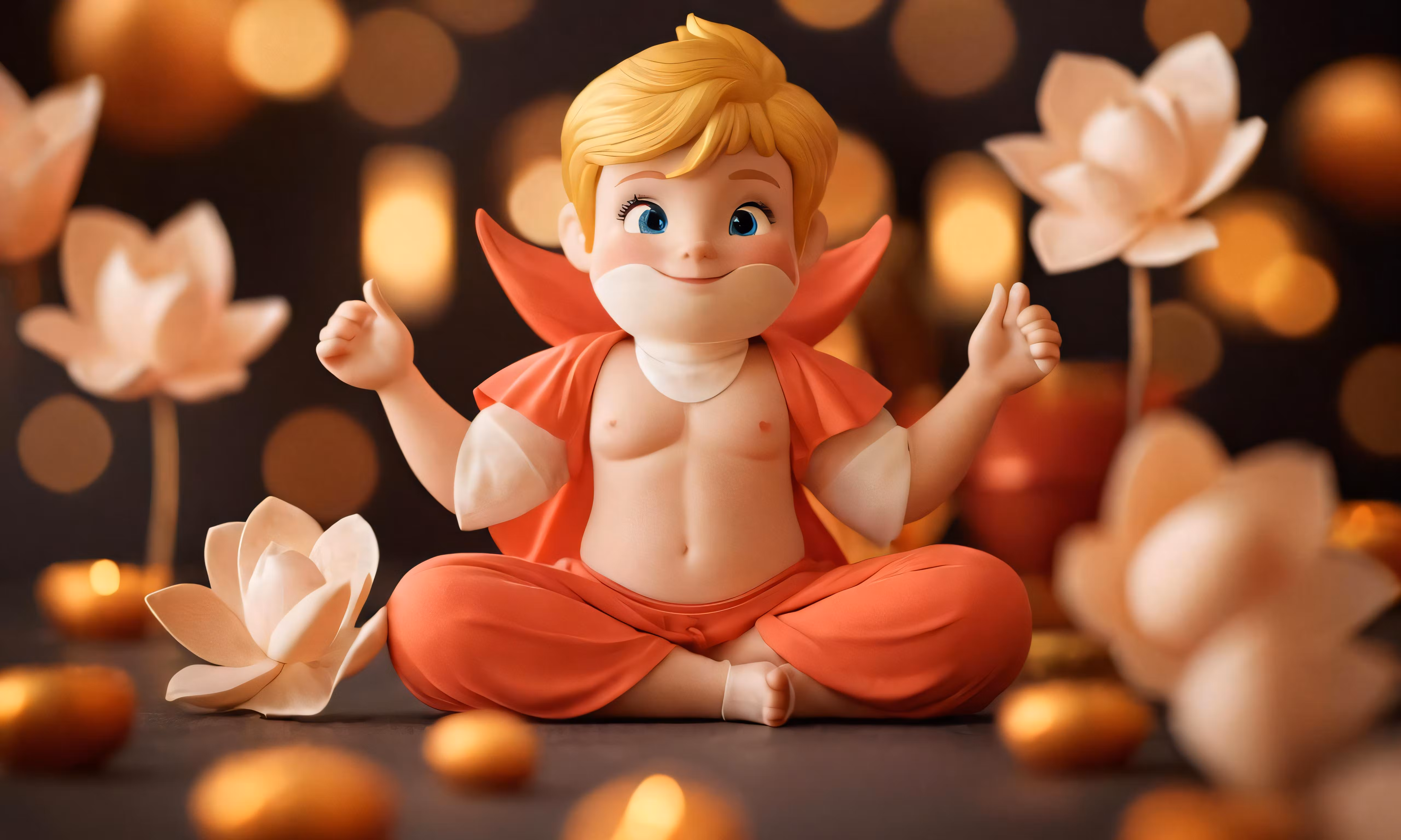 High resolution picture, free to use, a little statue with blond hair sitting on the ground and posing for a photo