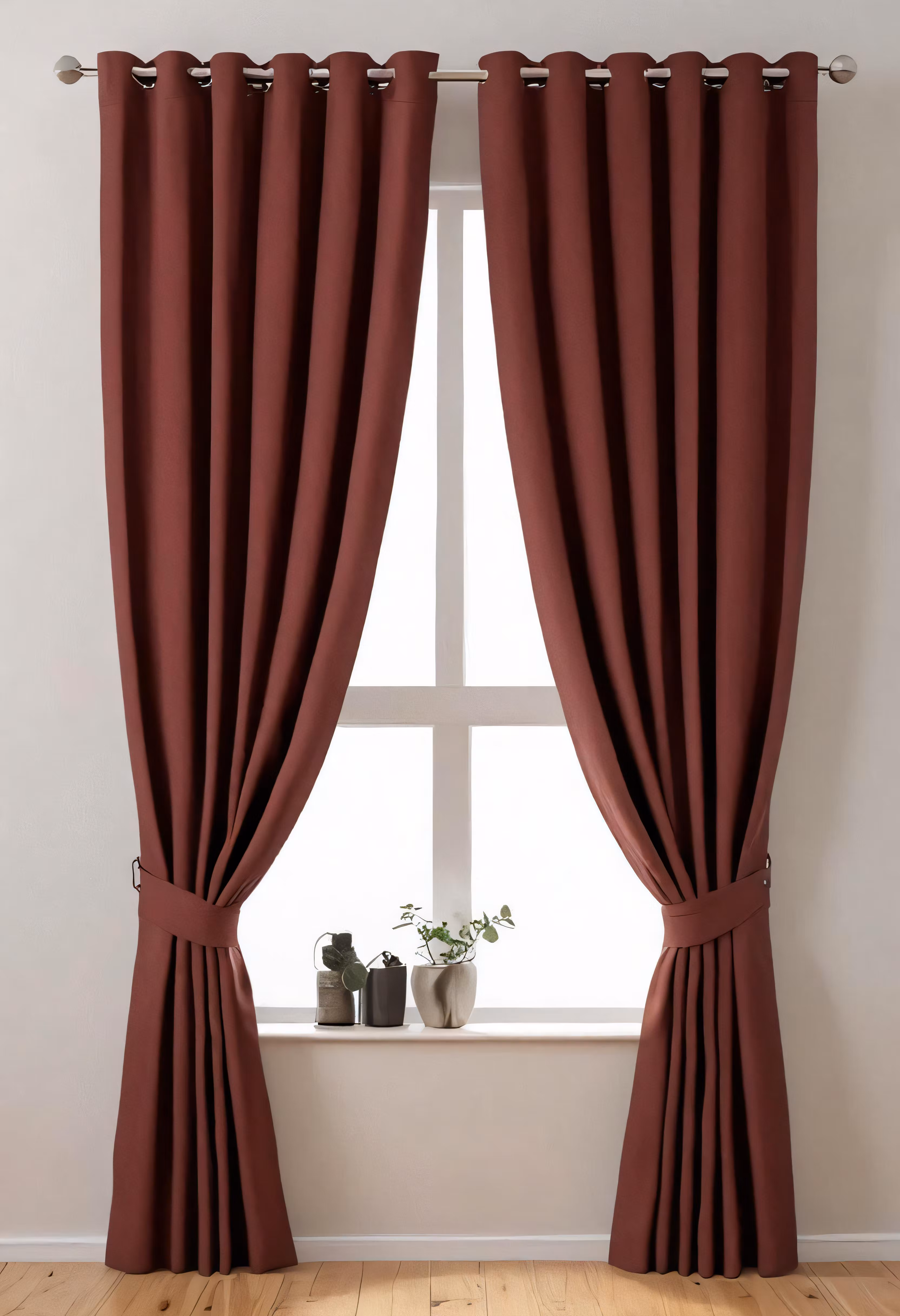 High resolution picture, free to use, a living room window with red curtains and potted plants on the window sill