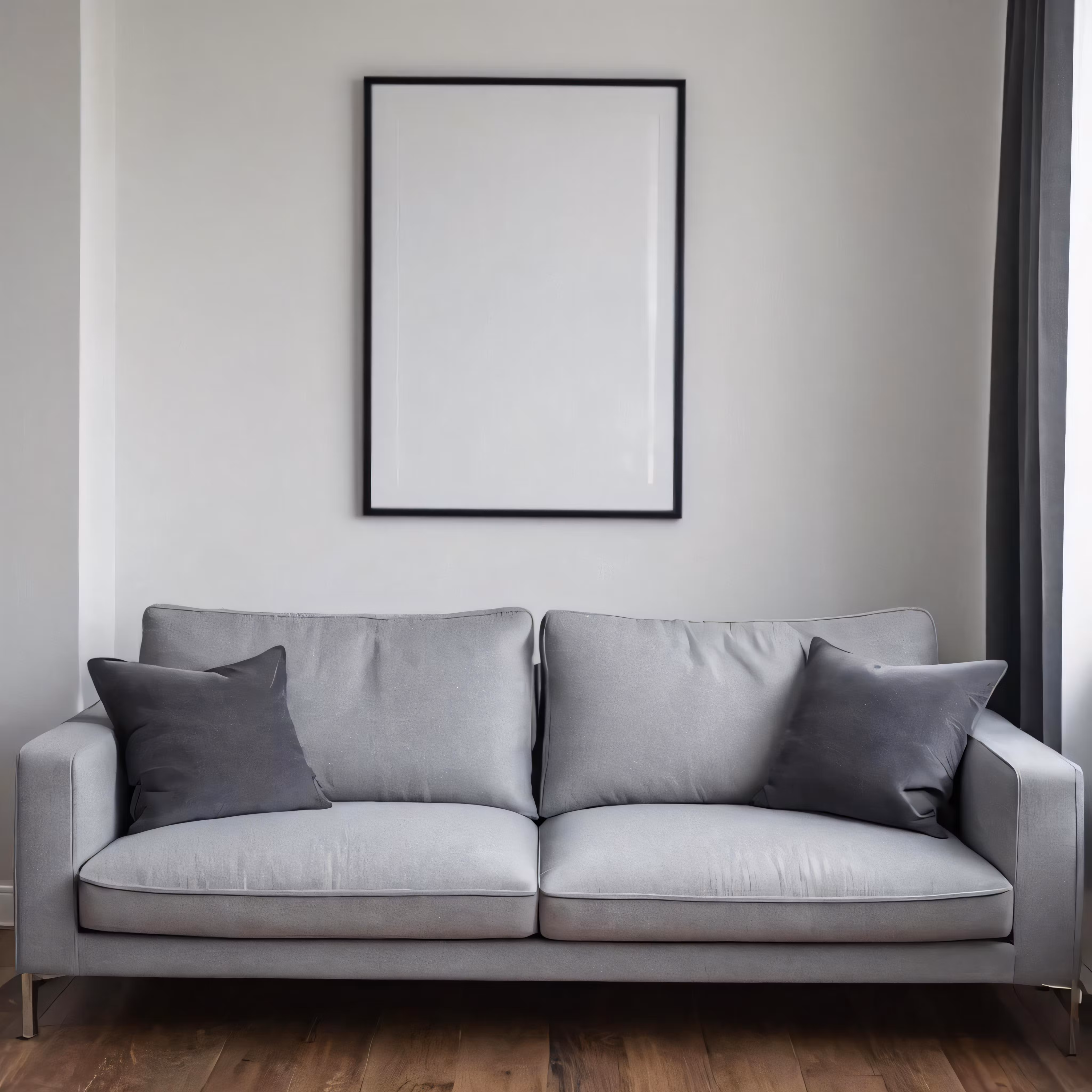 High resolution picture, free to use, a living room with a gray sofa and framed picture