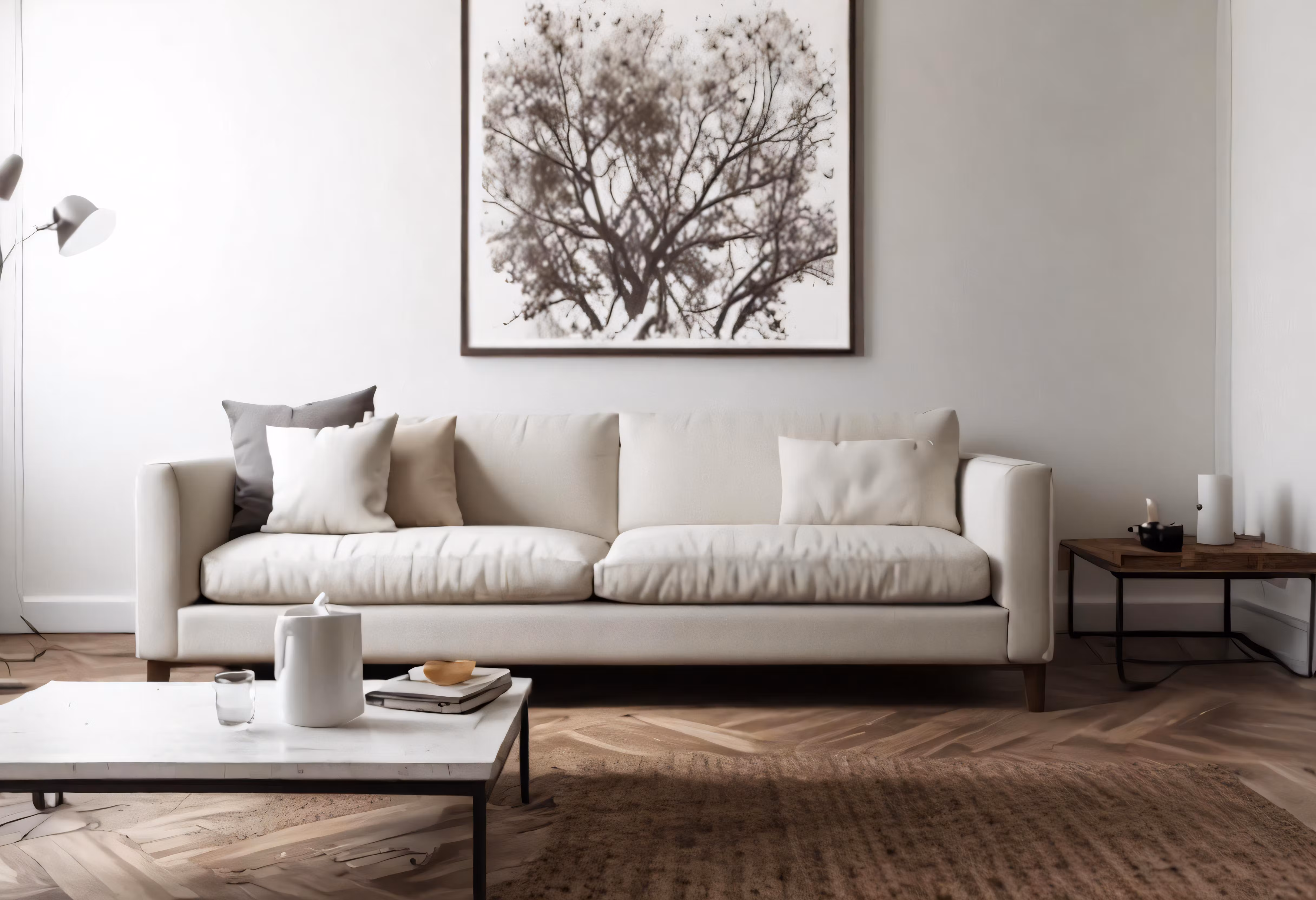 High resolution picture, free to use, a living room with a white couch and a coffee table