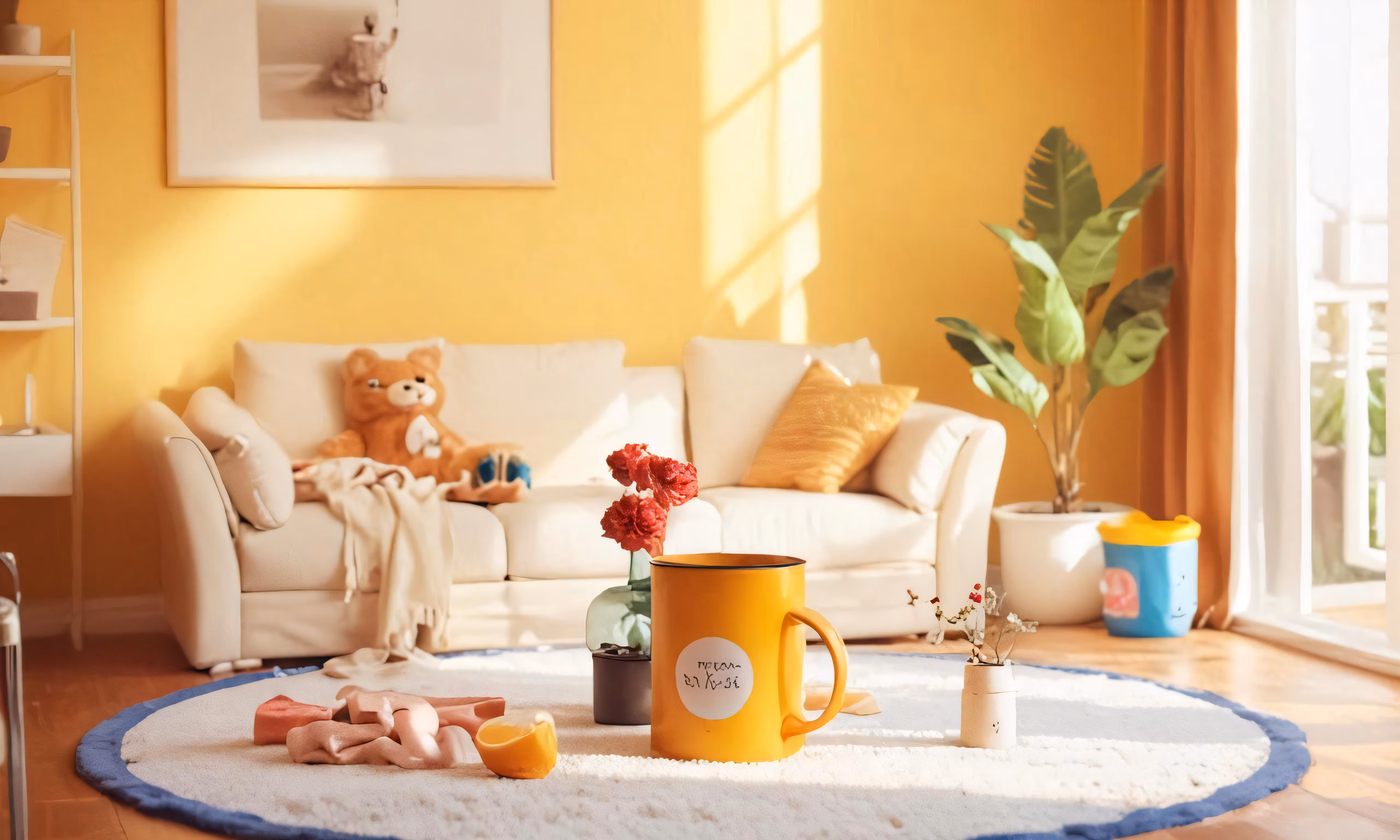 High resolution picture, free to use, a living room with a yellow wall and coffee mug