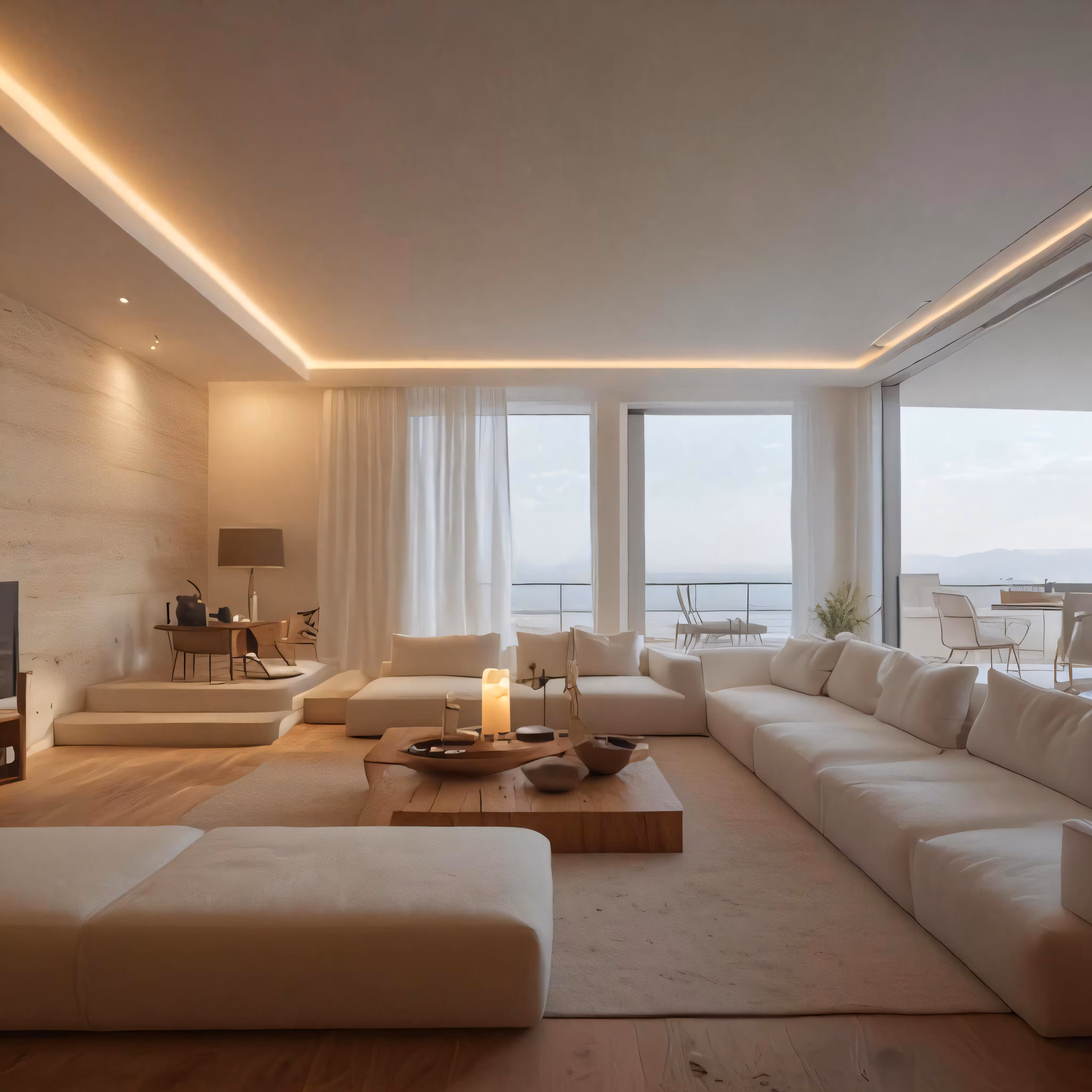 High resolution picture, free to use, a living room with couches and tables is lit by lights