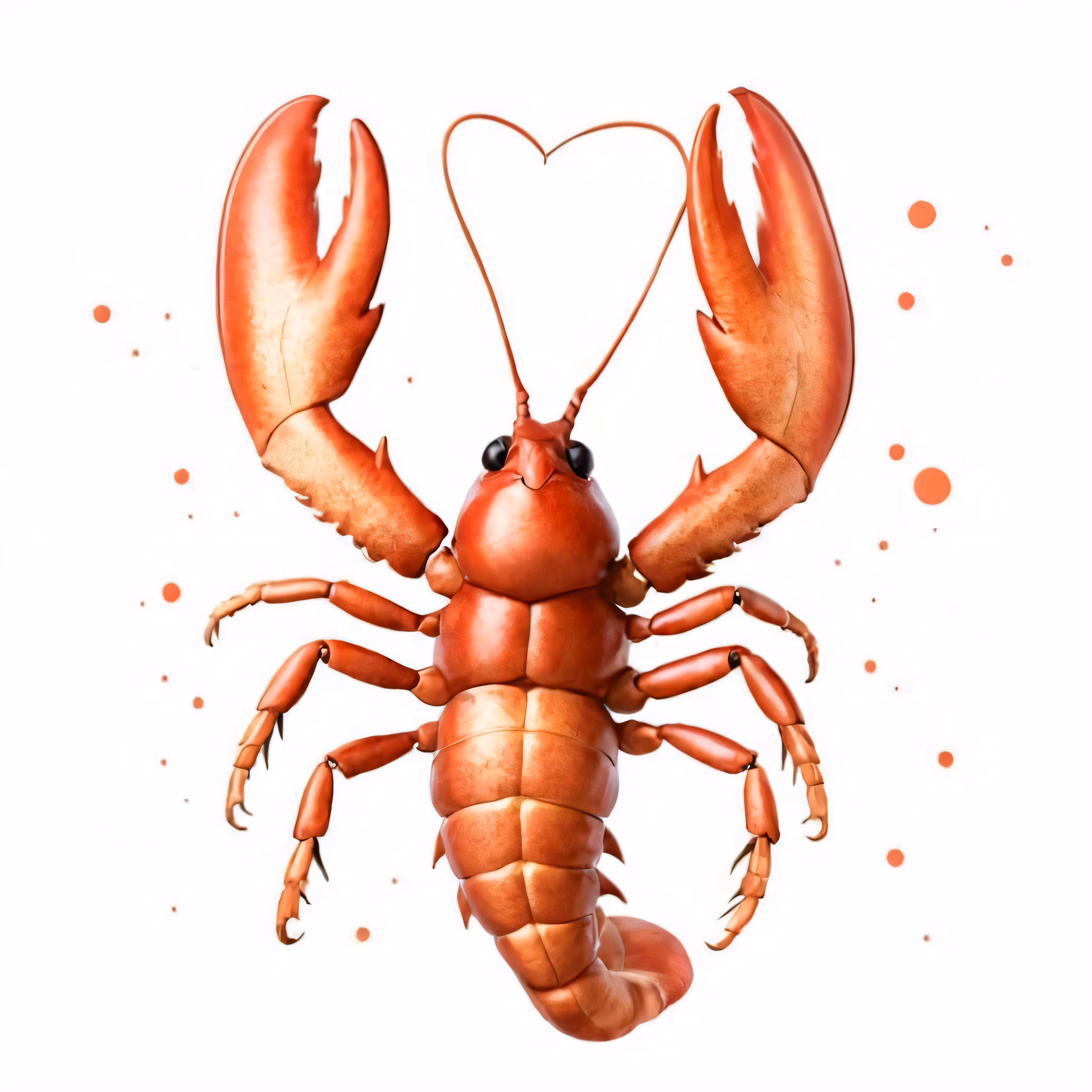 High resolution picture, free to use, a lobster with two claws, a heart shaped tail and a nose protruding out from its shell