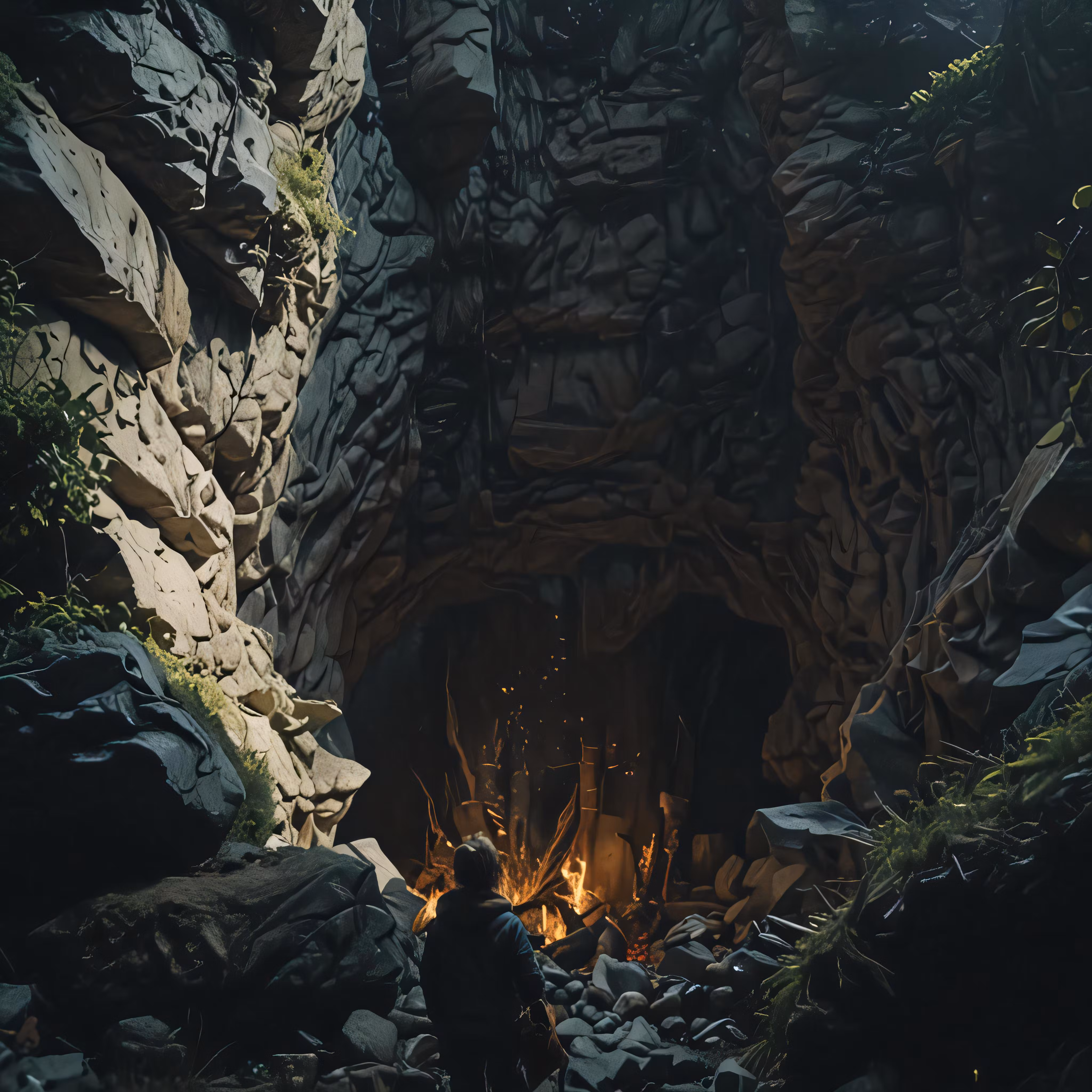 High resolution picture, free to use, a lone hiker stands in the middle of a cave with some rocks