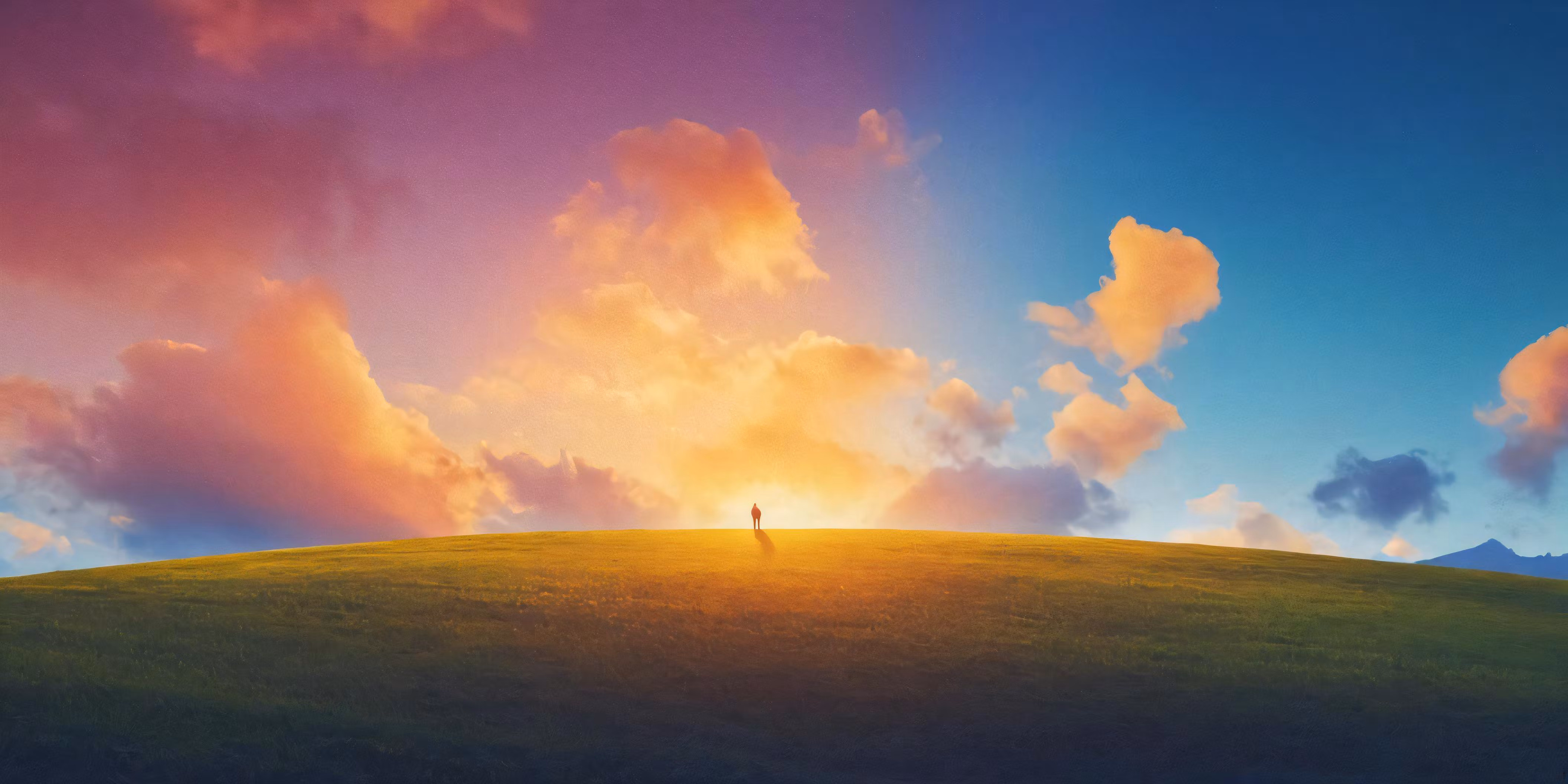 High resolution picture, free to use, a lone person standing on a hill with the sun setting