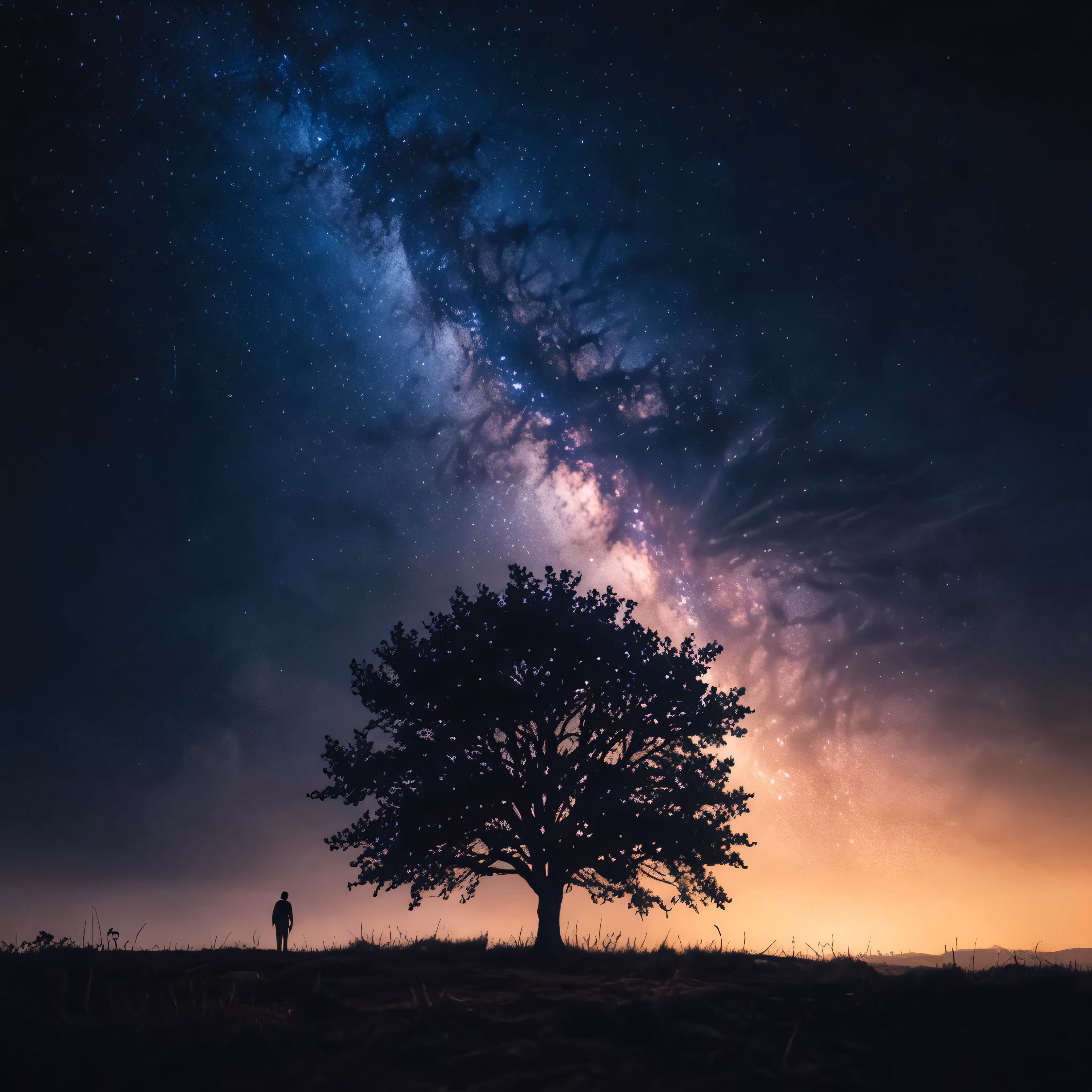 High resolution picture, free to use, a lone tree on a grassy field with a star filled sky in the background
