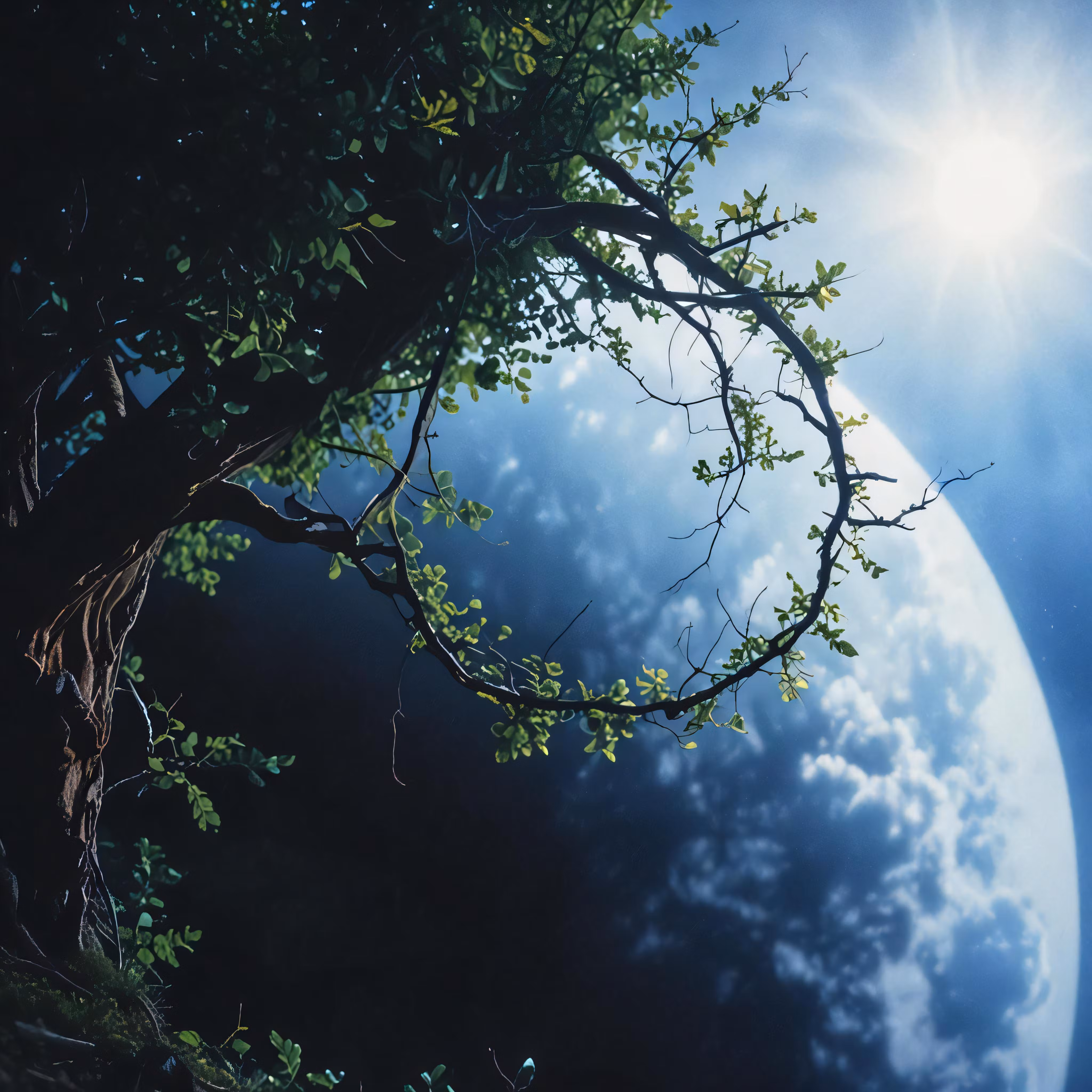 High resolution picture, free to use, a lone tree sits in the middle of a landscape with a moon, grass and trees around it