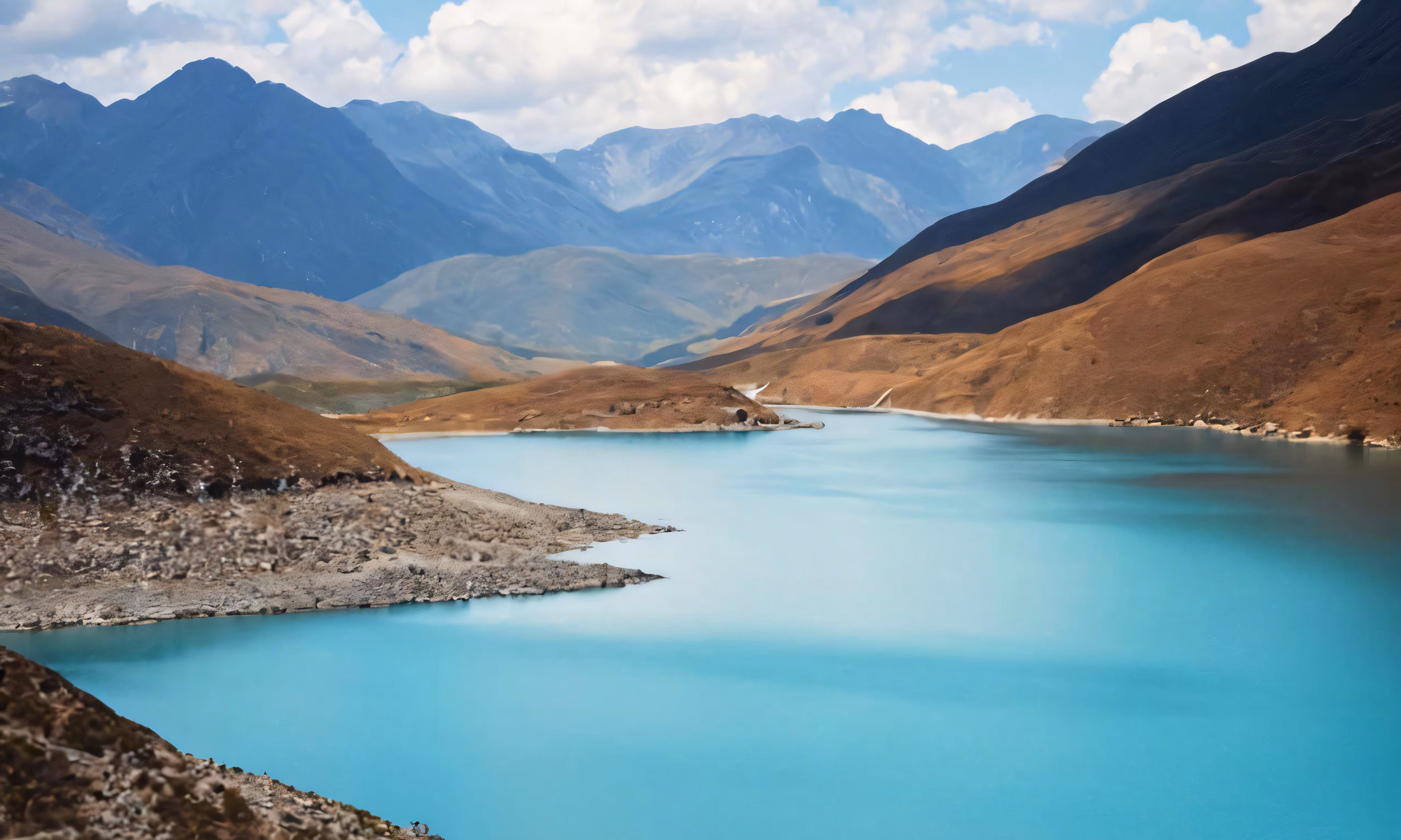 High resolution picture, free to use, a long body of blue water with mountains in the background