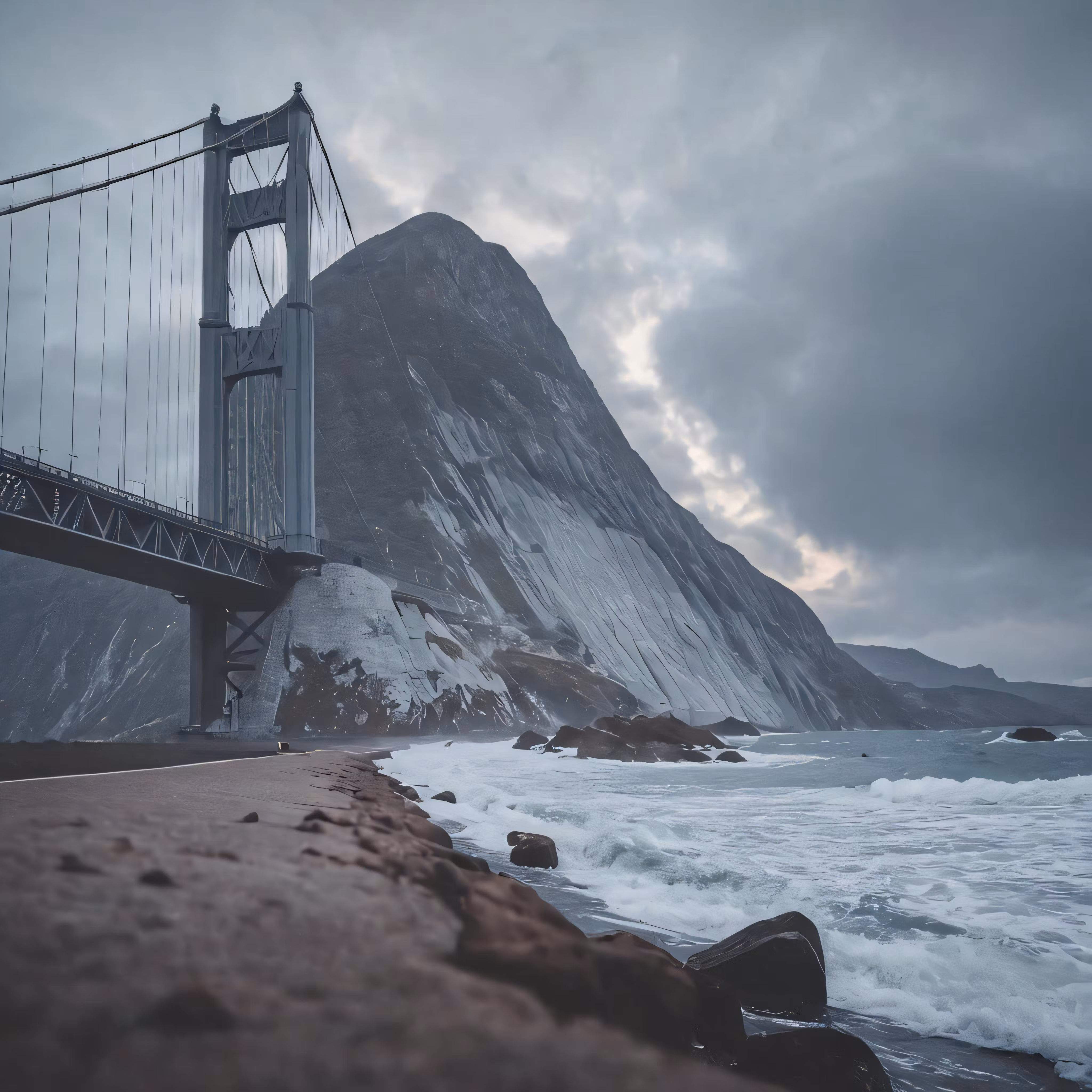 High resolution picture, free to use, a long bridge spans over the ocean next to a mountain