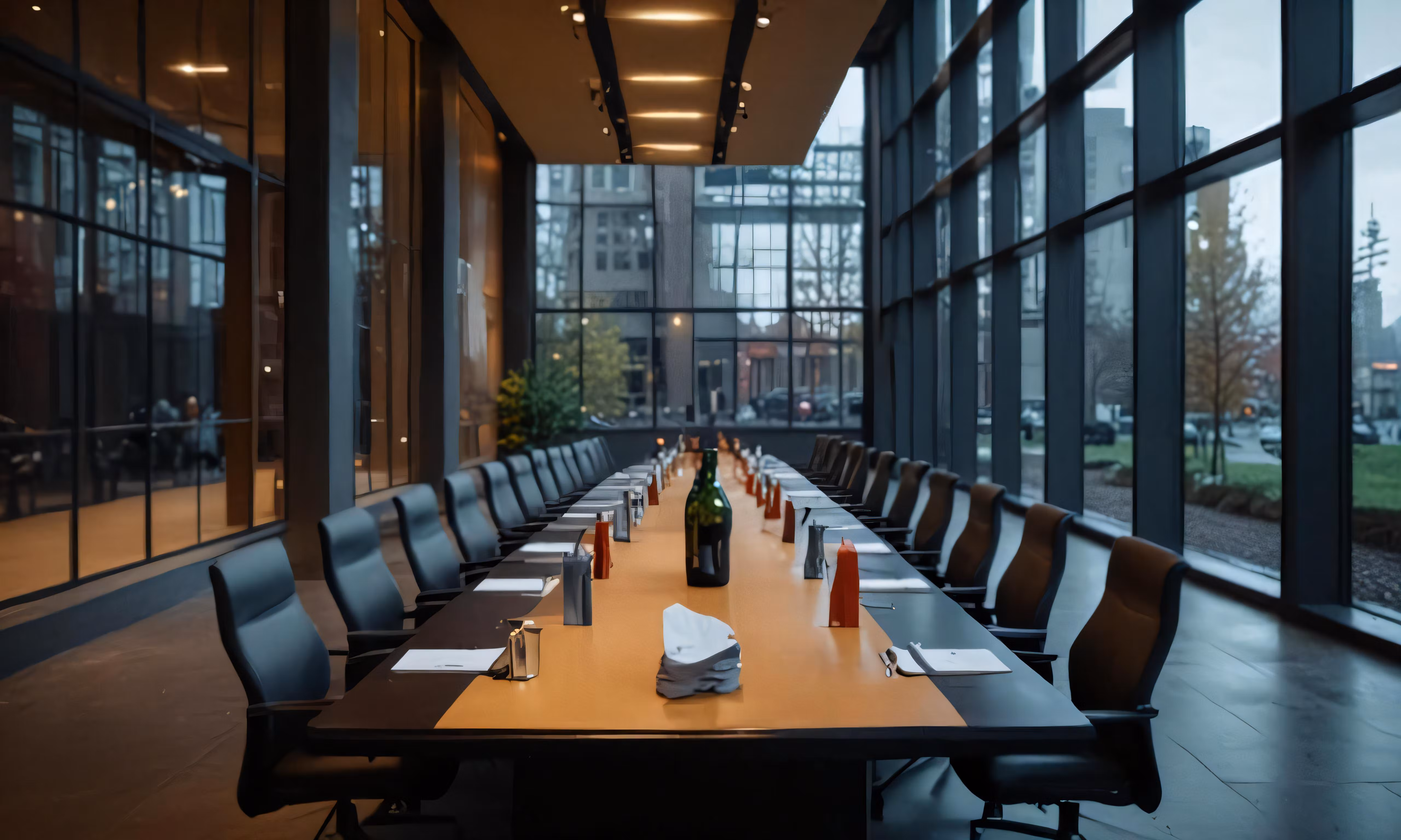 High resolution picture, free to use, a long conference table with six chairs is empty