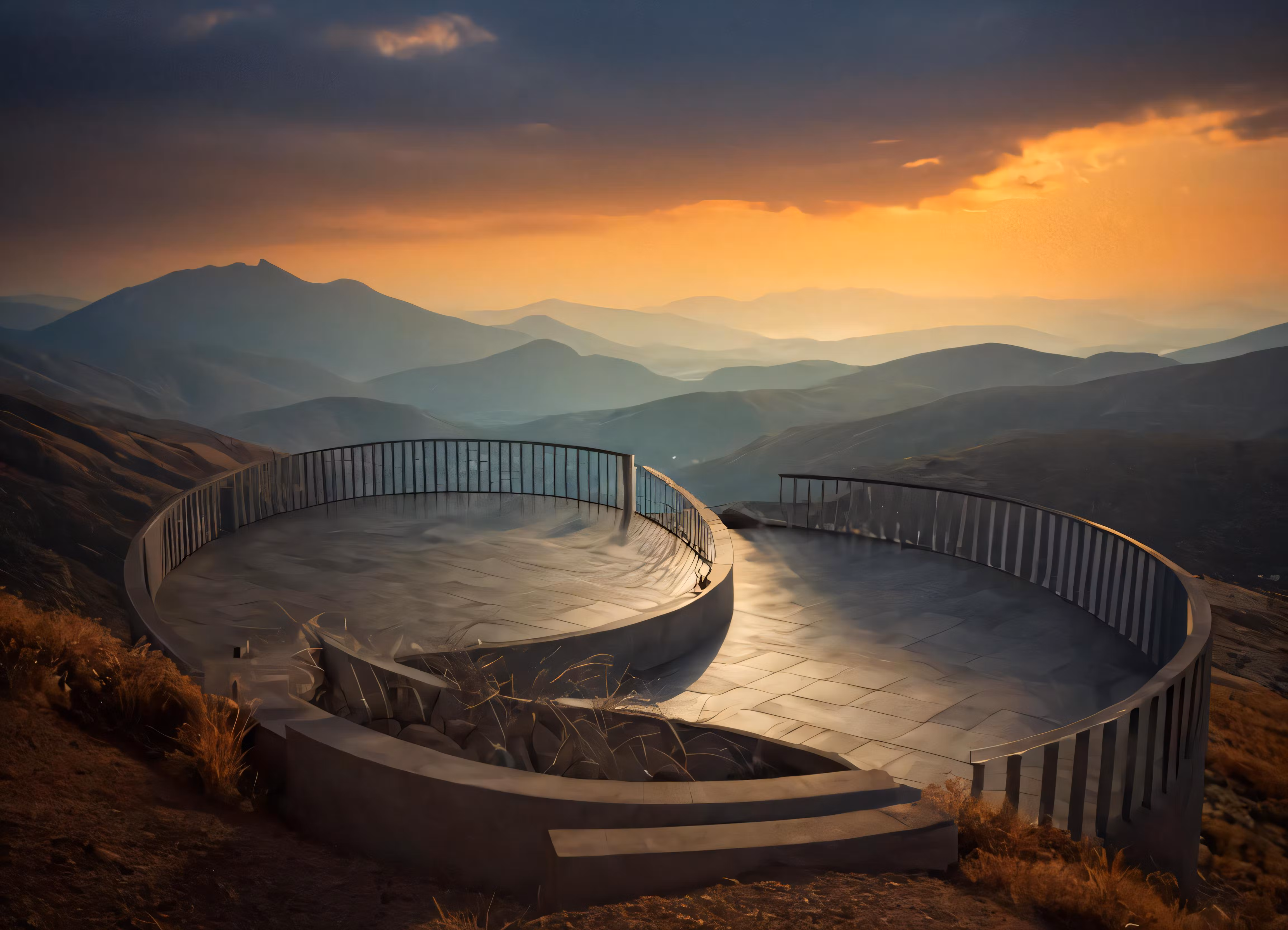 High resolution picture, free to use, a long curved concrete staircase sits on top of a mountain