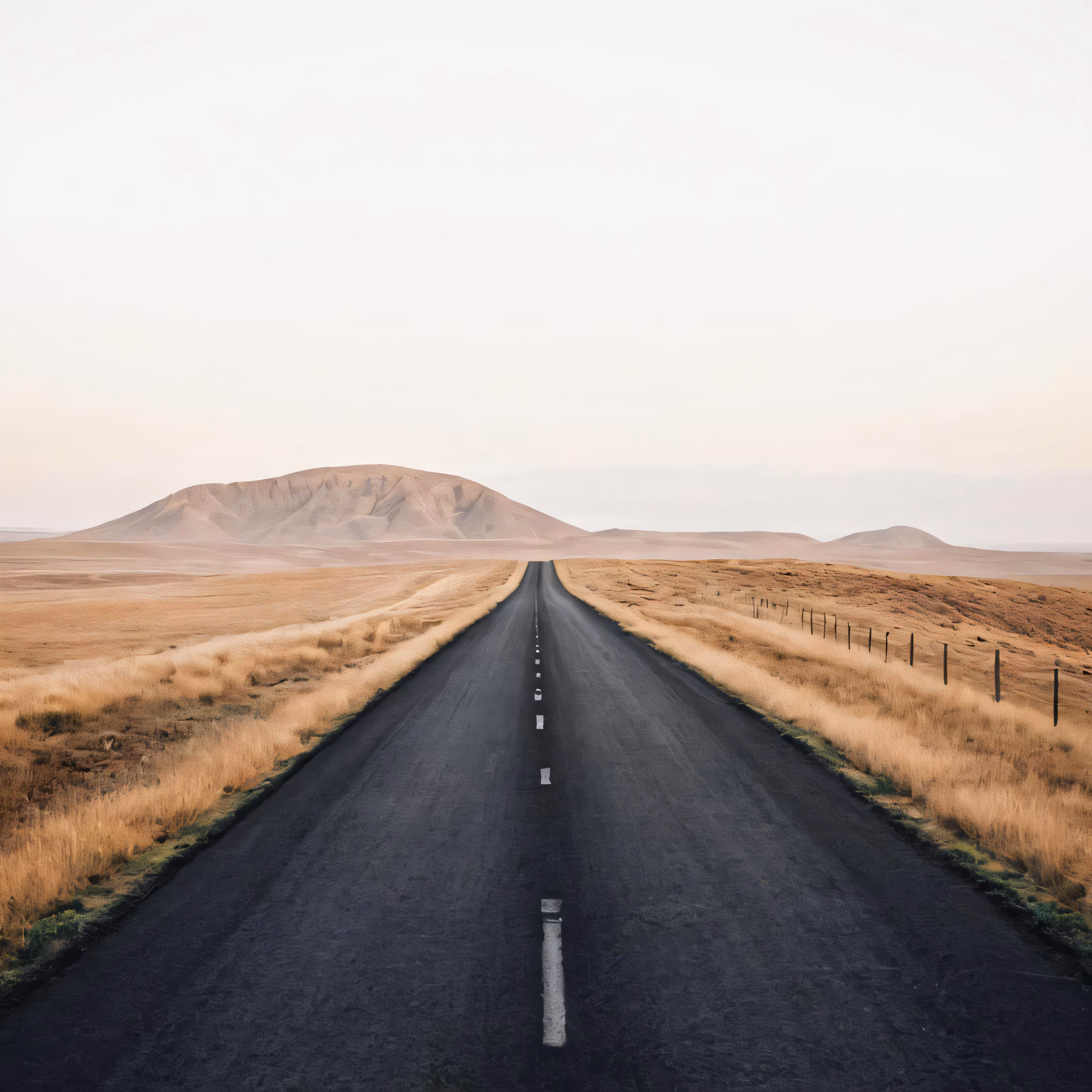 High resolution picture, free to use, a long empty street between grassy field with mountains