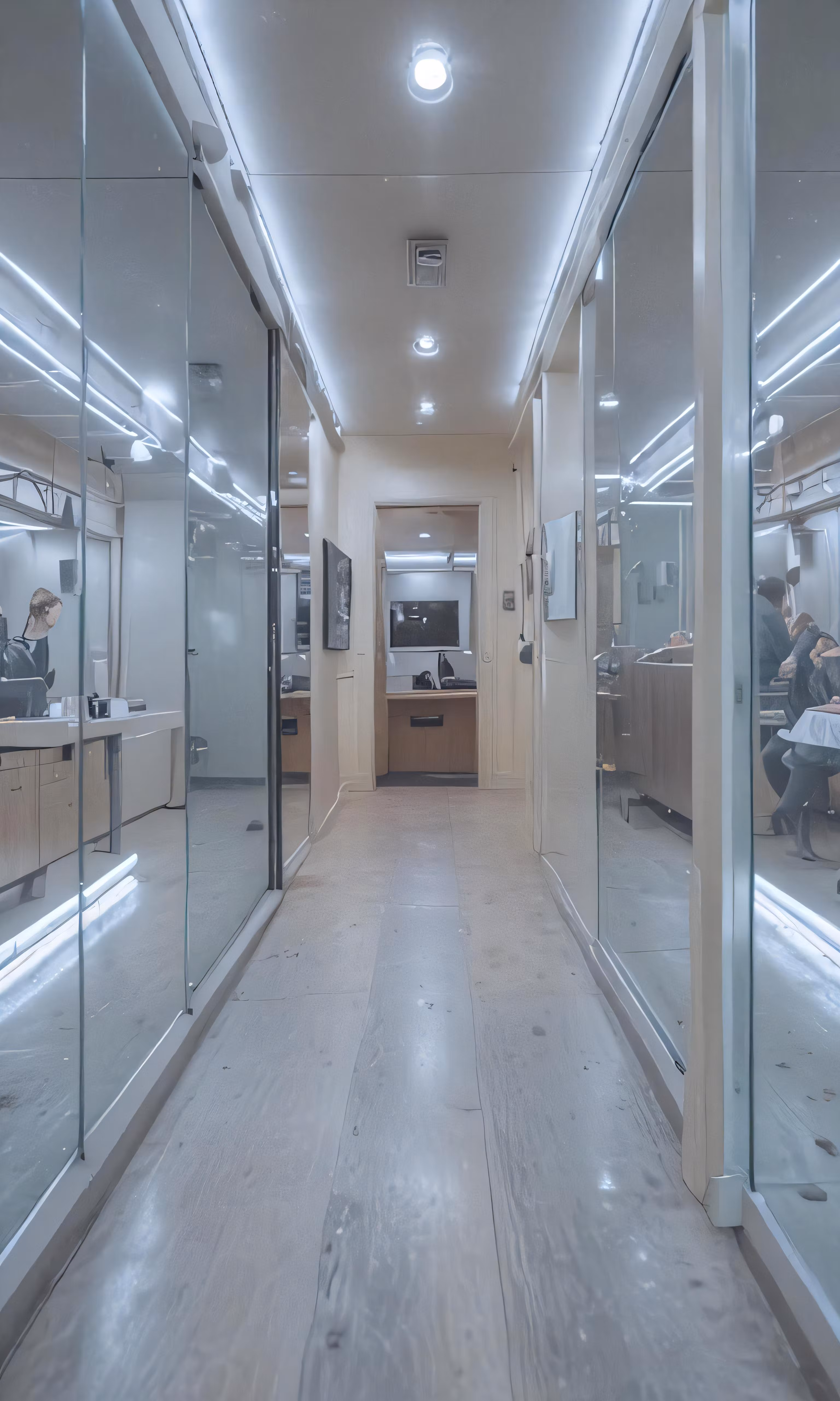High resolution picture, free to use, a long hallway between a couple of glass doors