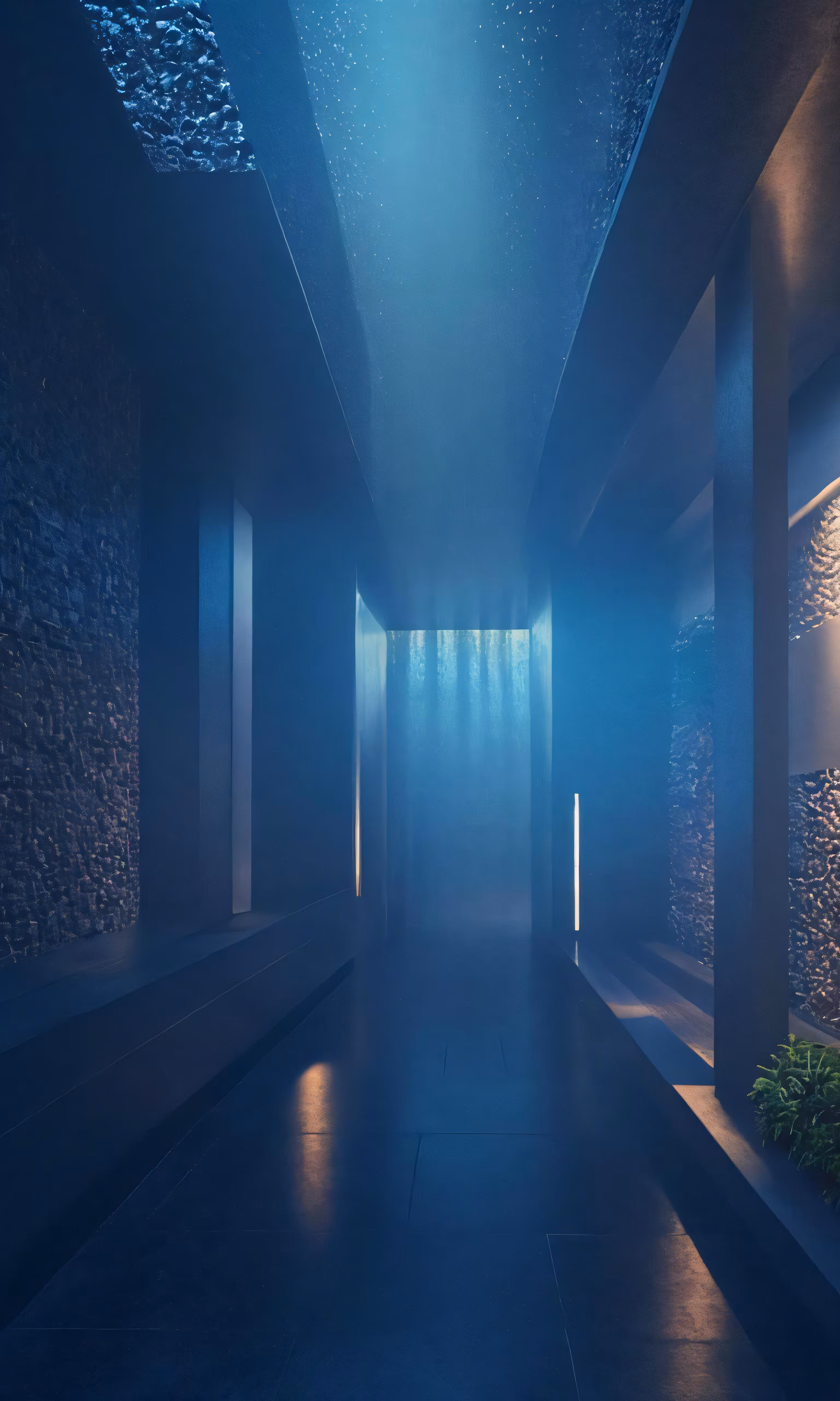 High resolution picture, free to use, a long hallway lit up with lighting and blue hues