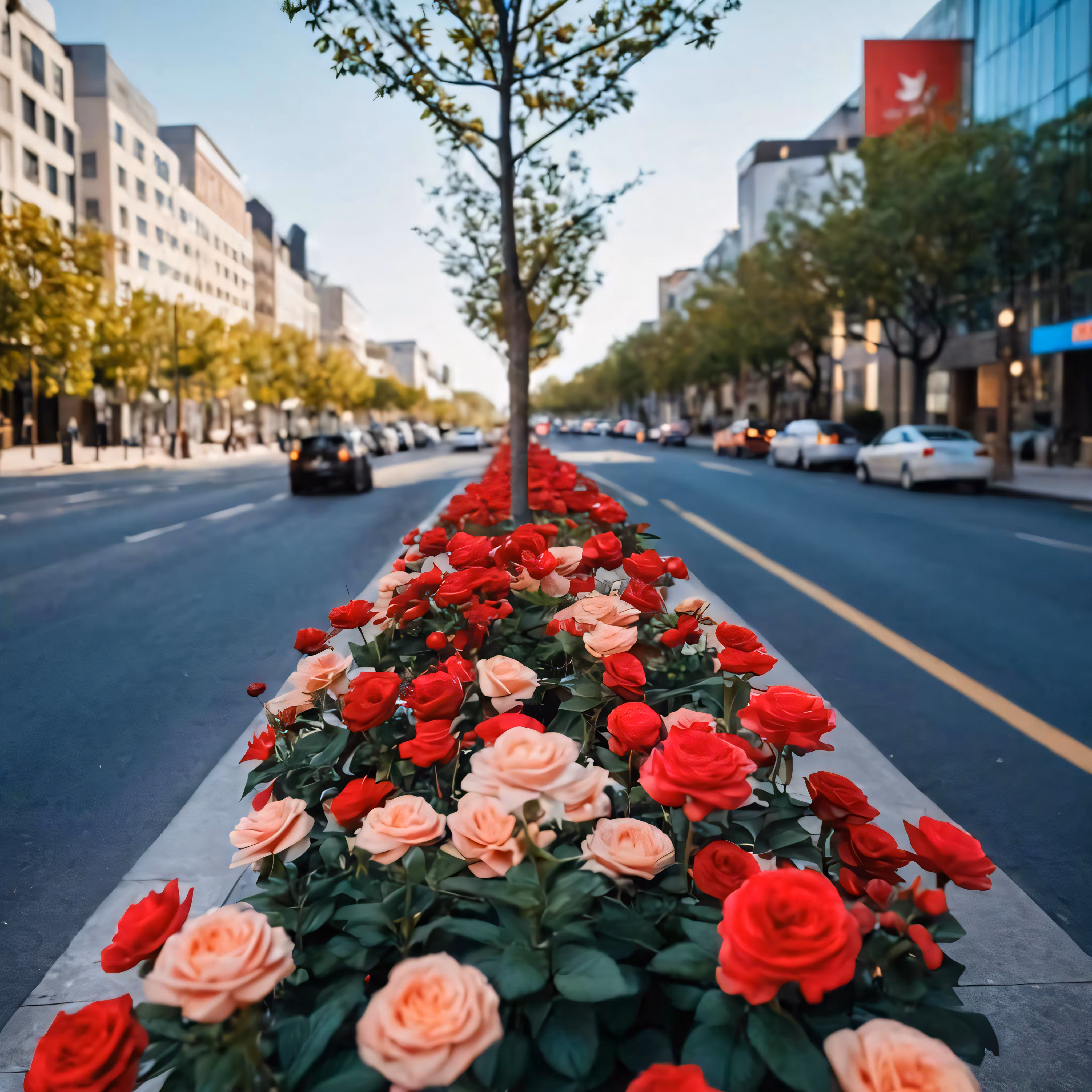High resolution picture, free to use, a long row of flowers line the side of a city street