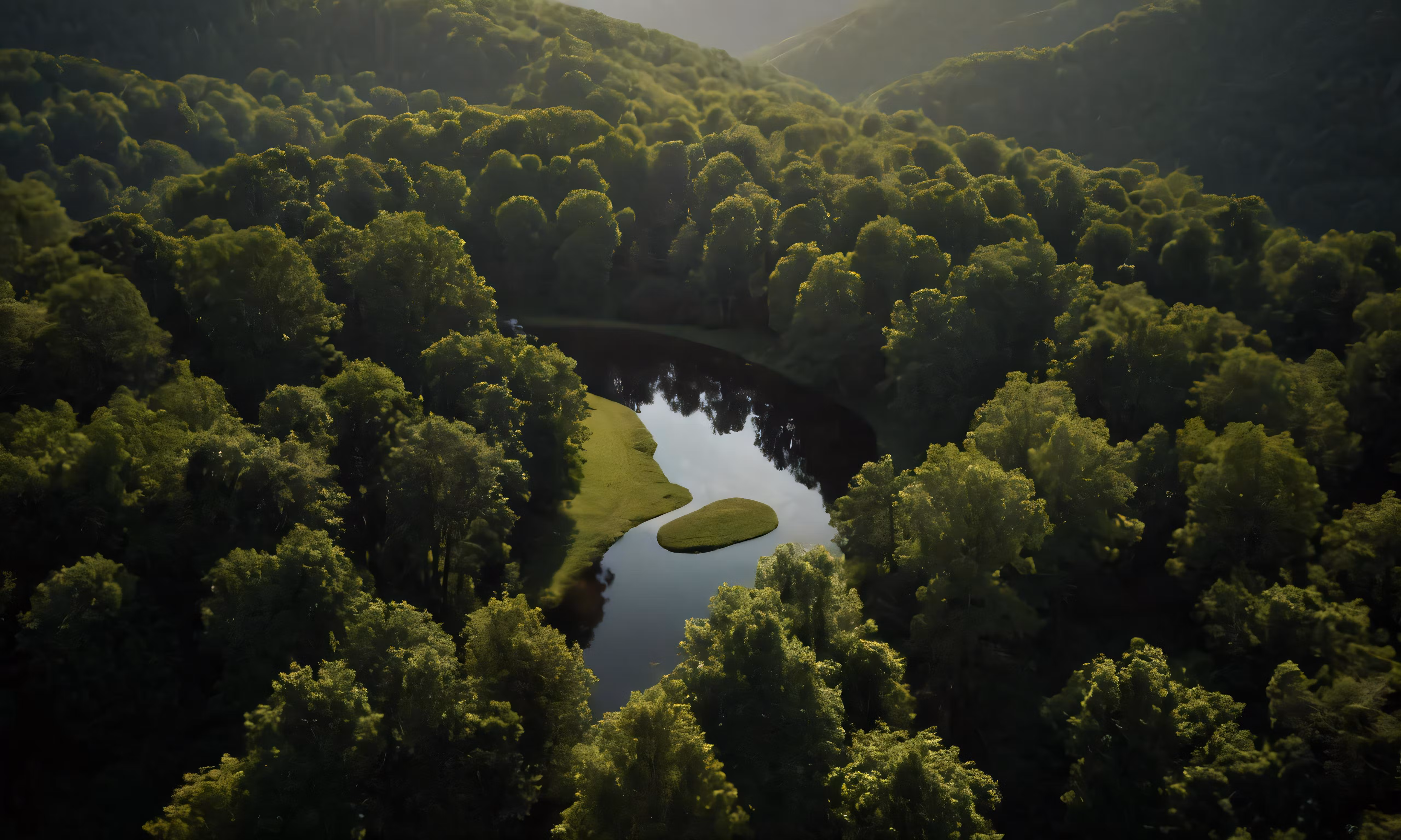 High resolution picture, free to use, a lush green forest next to a lake in the middle of it