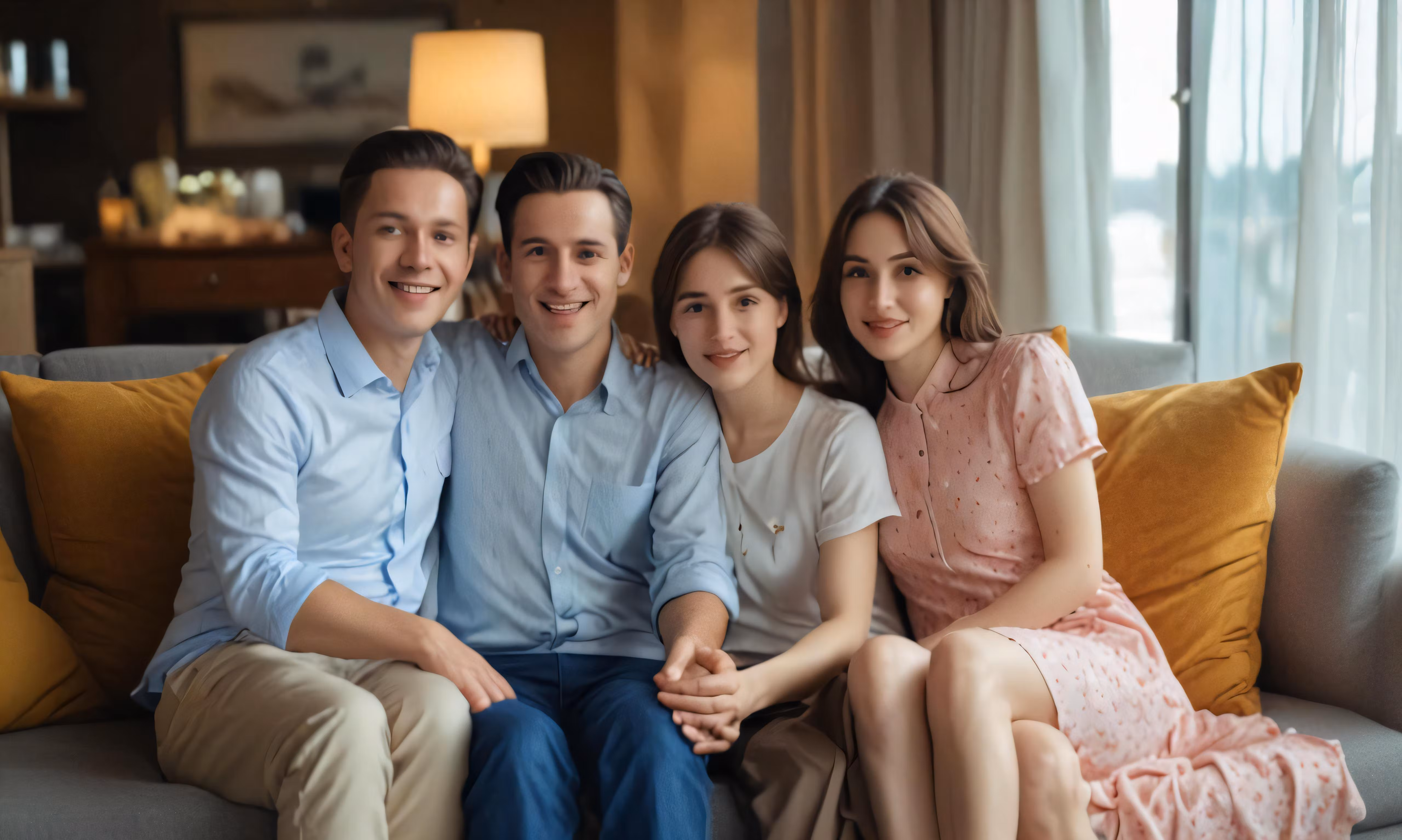 High resolution picture, free to use, a man, two women, a boy, and a girl are sitting together on a couch