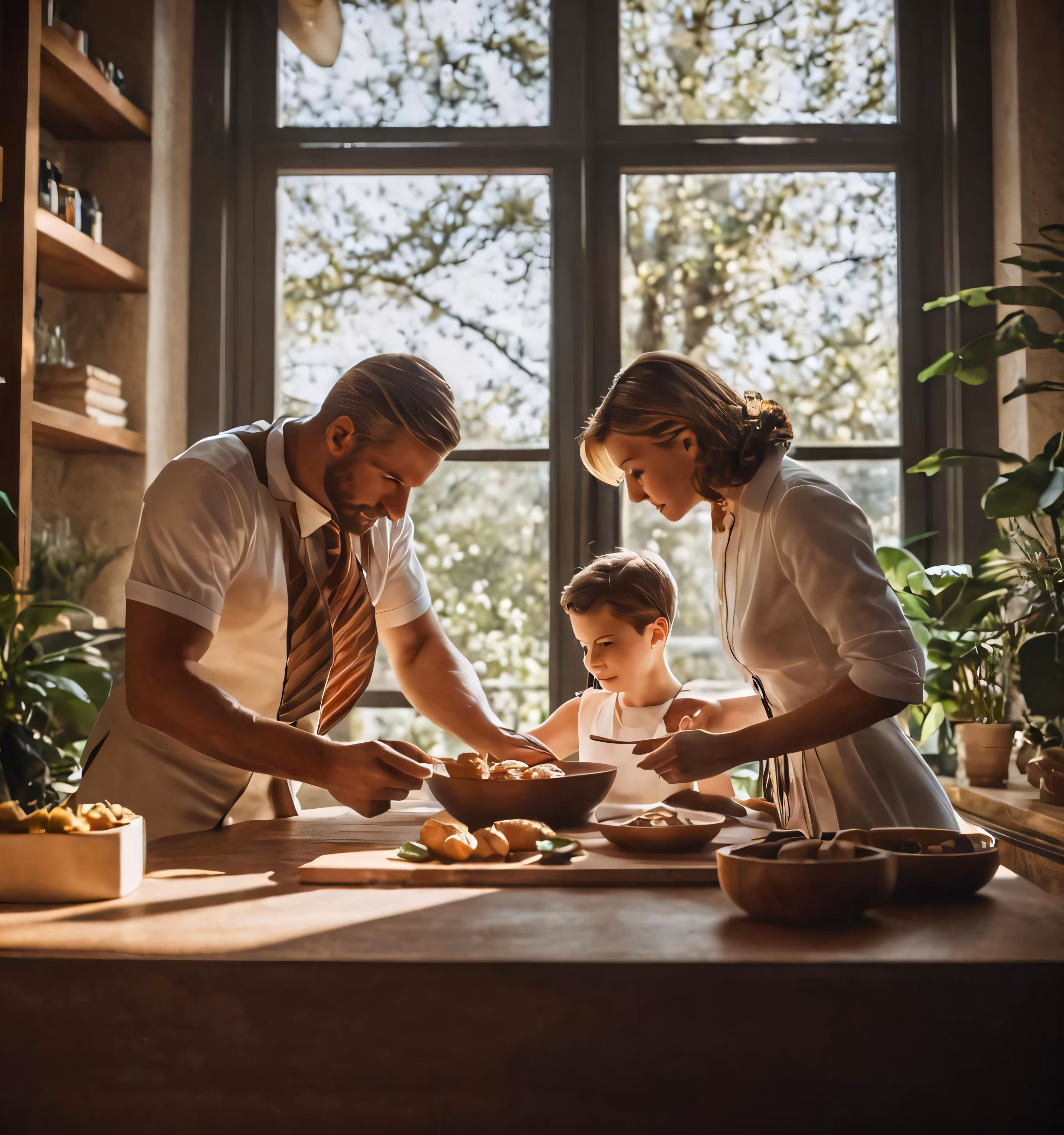 High resolution picture, free to use, a man and a woman preparing food while a little boy sits at the table in front of them