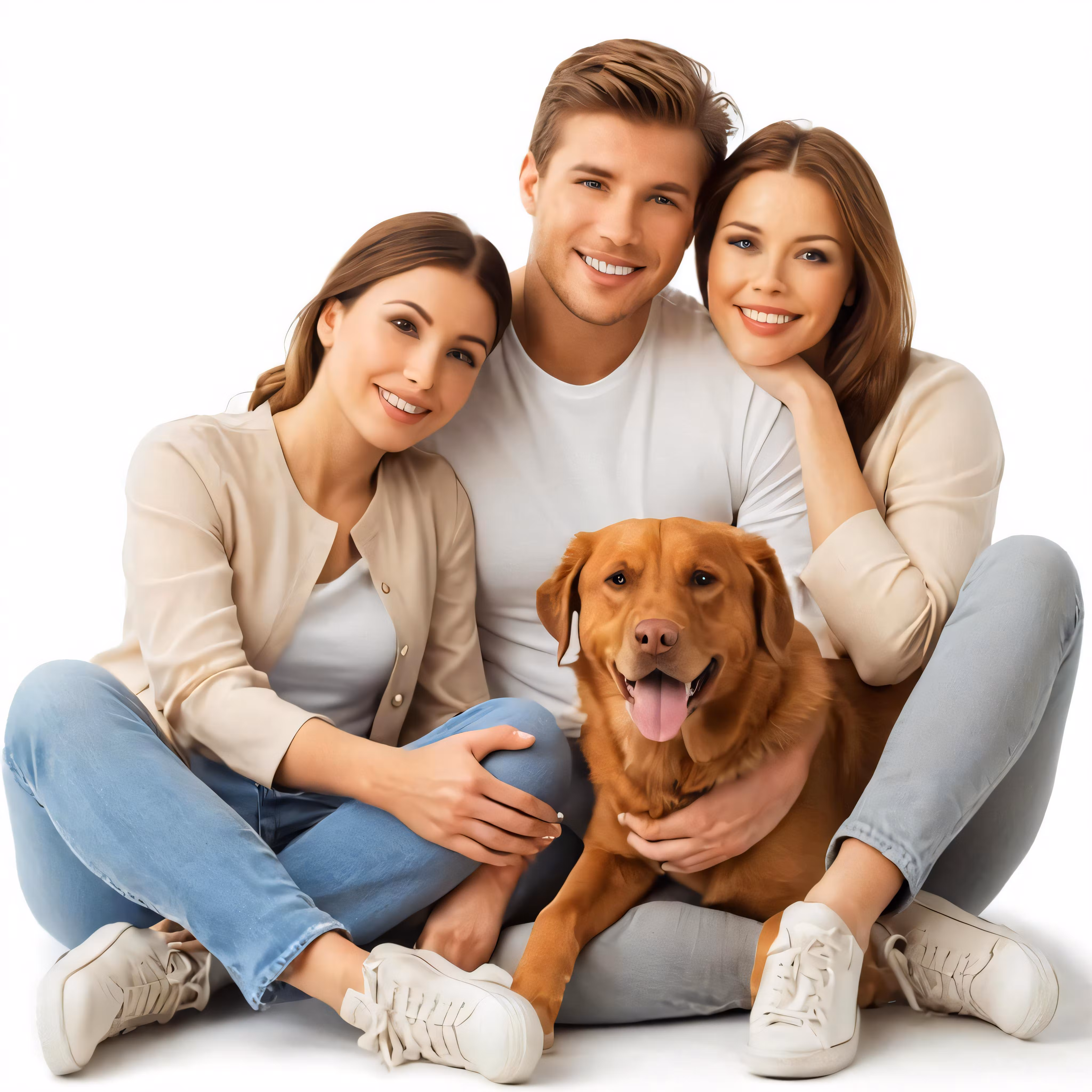 High resolution picture, free to use, a man and two women sit beside a dog
