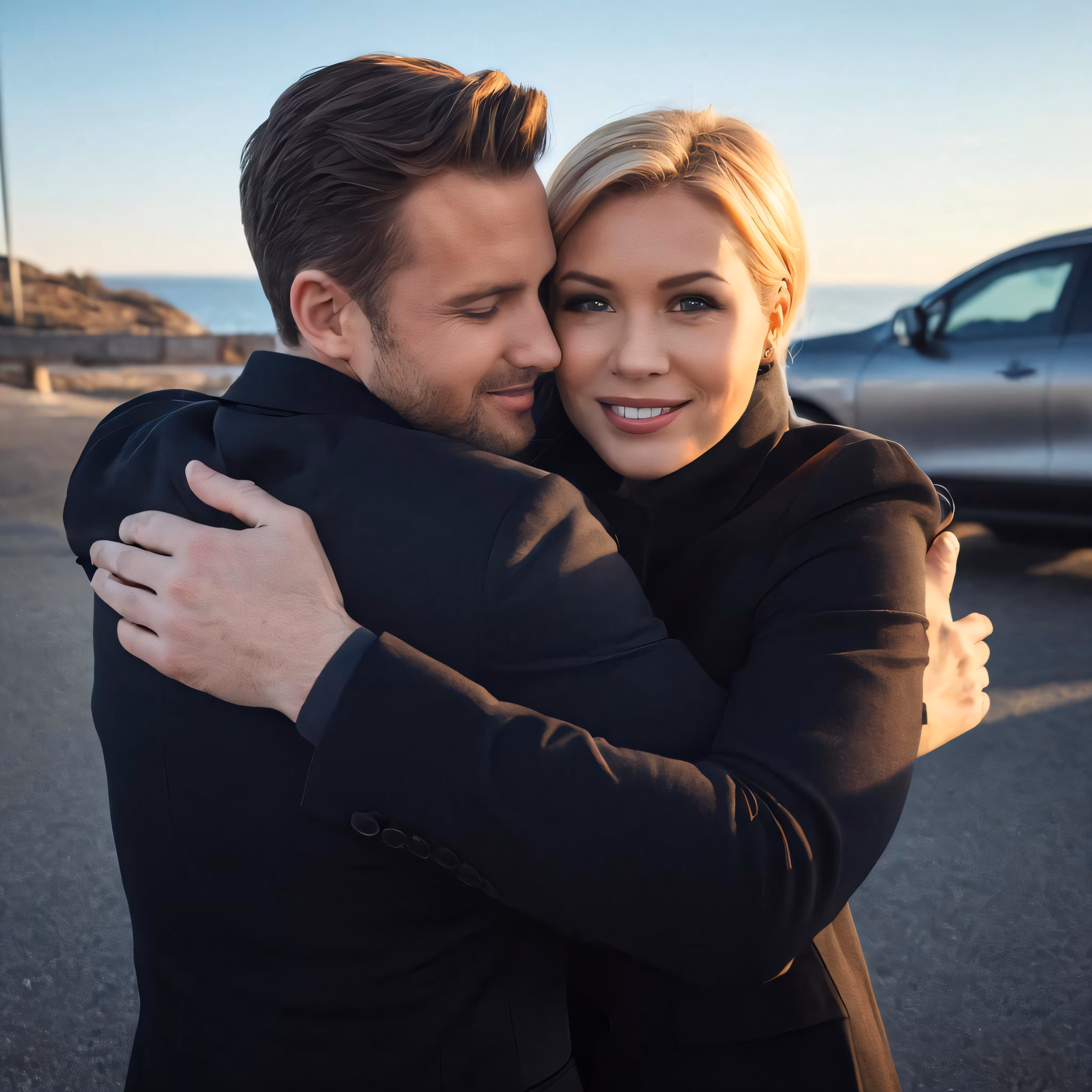 High resolution picture, free to use, a man and woman hugging outside of a car