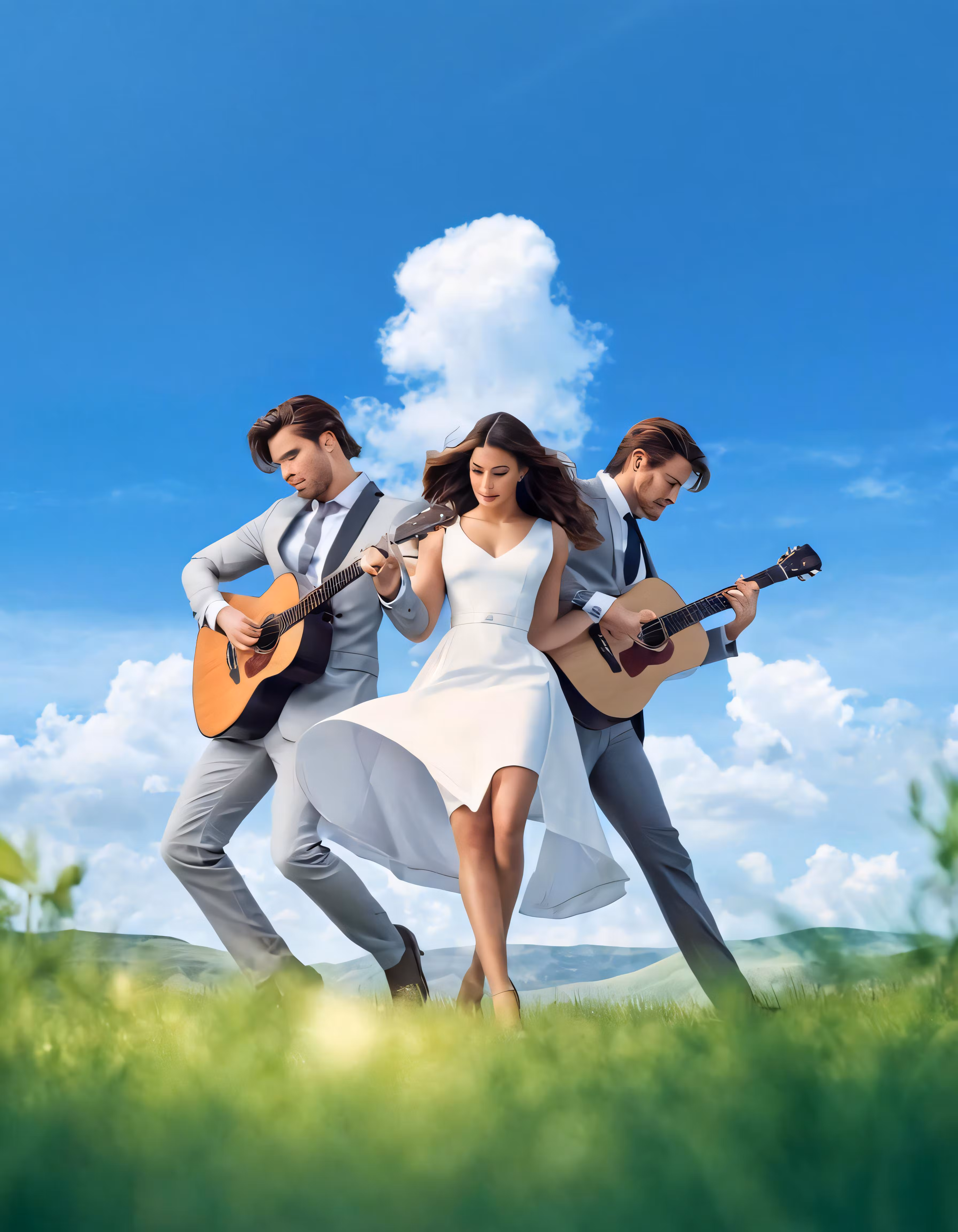 High resolution picture, free to use, a man and woman in the middle of a field holding guitars