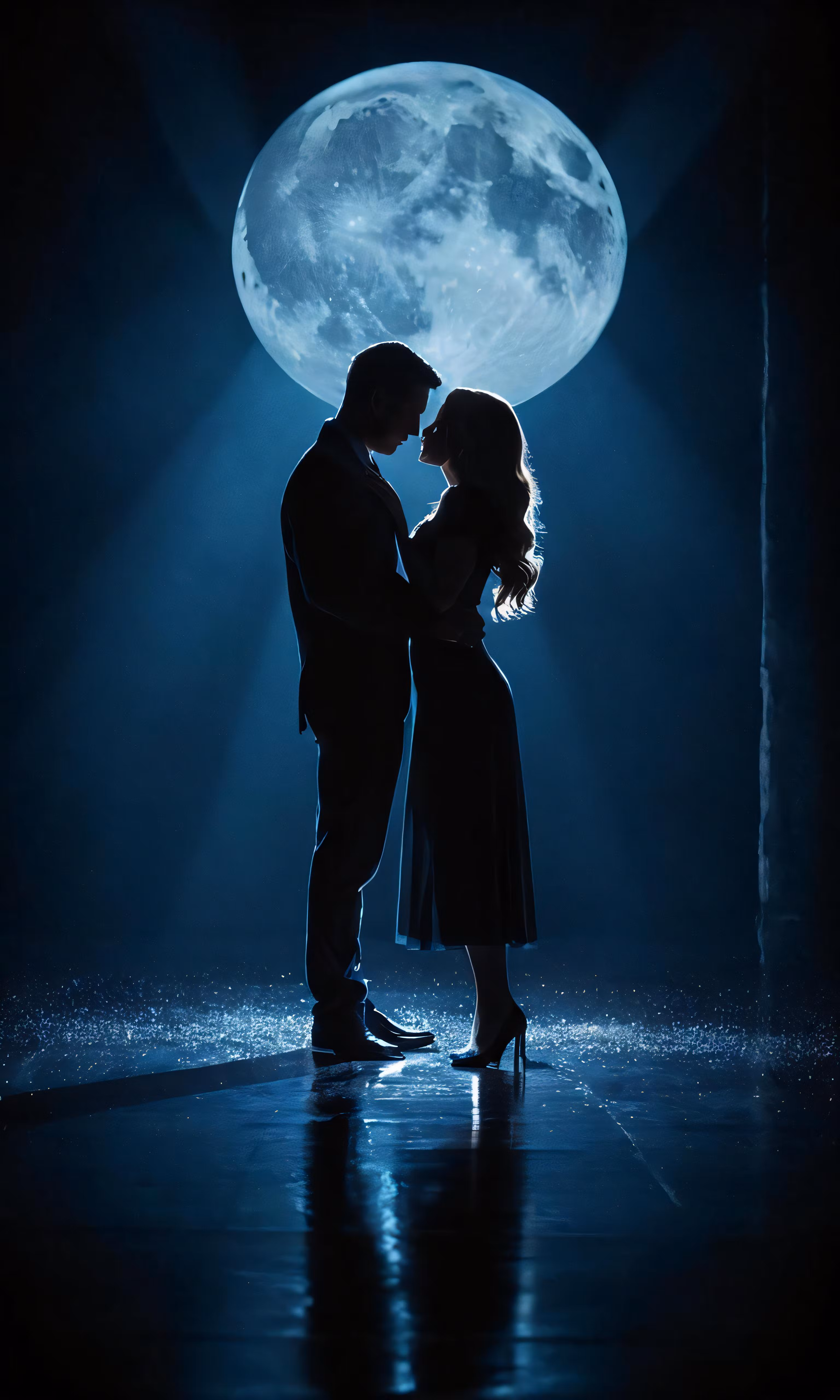 High resolution picture, free to use, a man and woman in the shadows of a large full moon with light shining through the