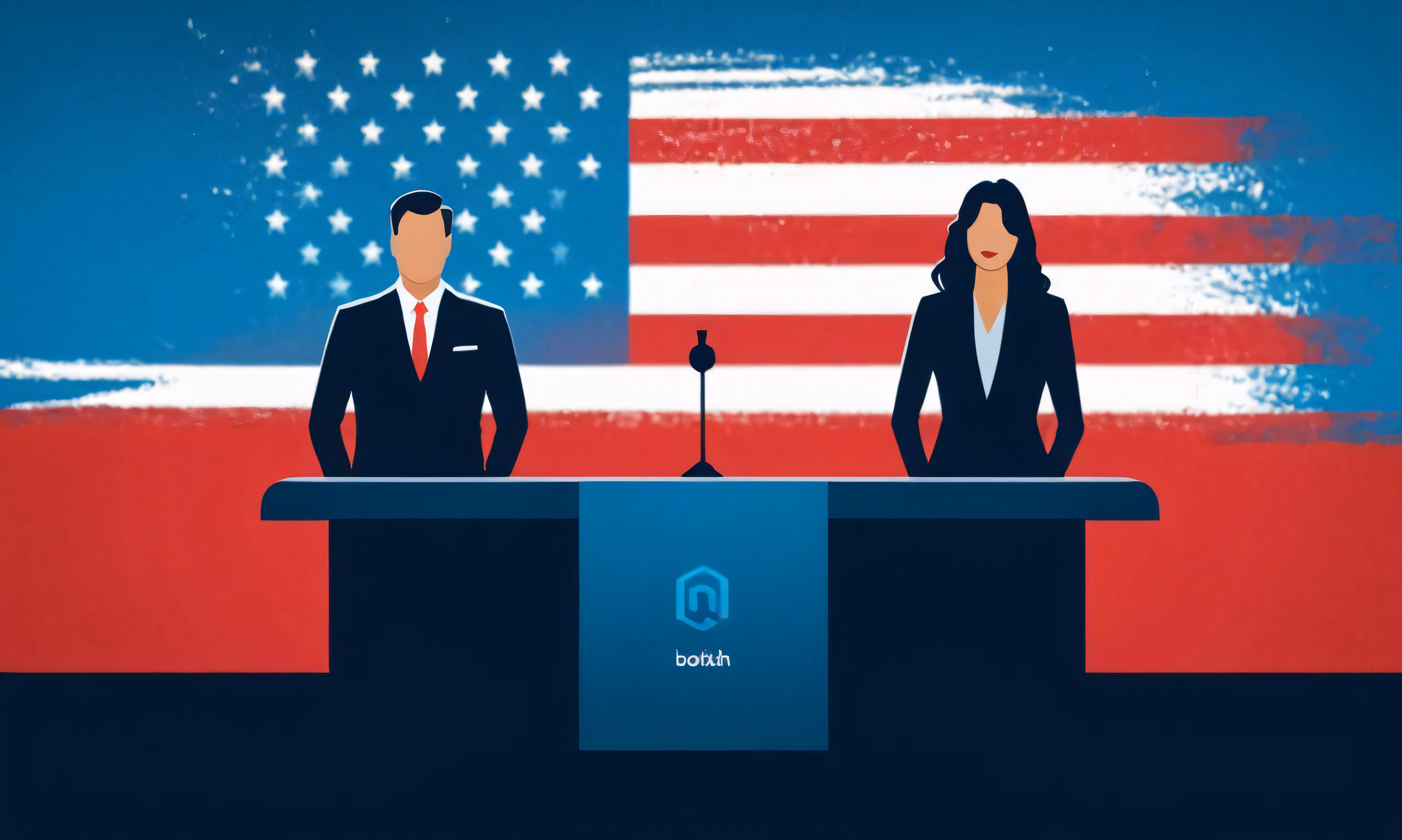 High resolution picture, free to use, a man and woman stand at a podium as an american flag is in the background