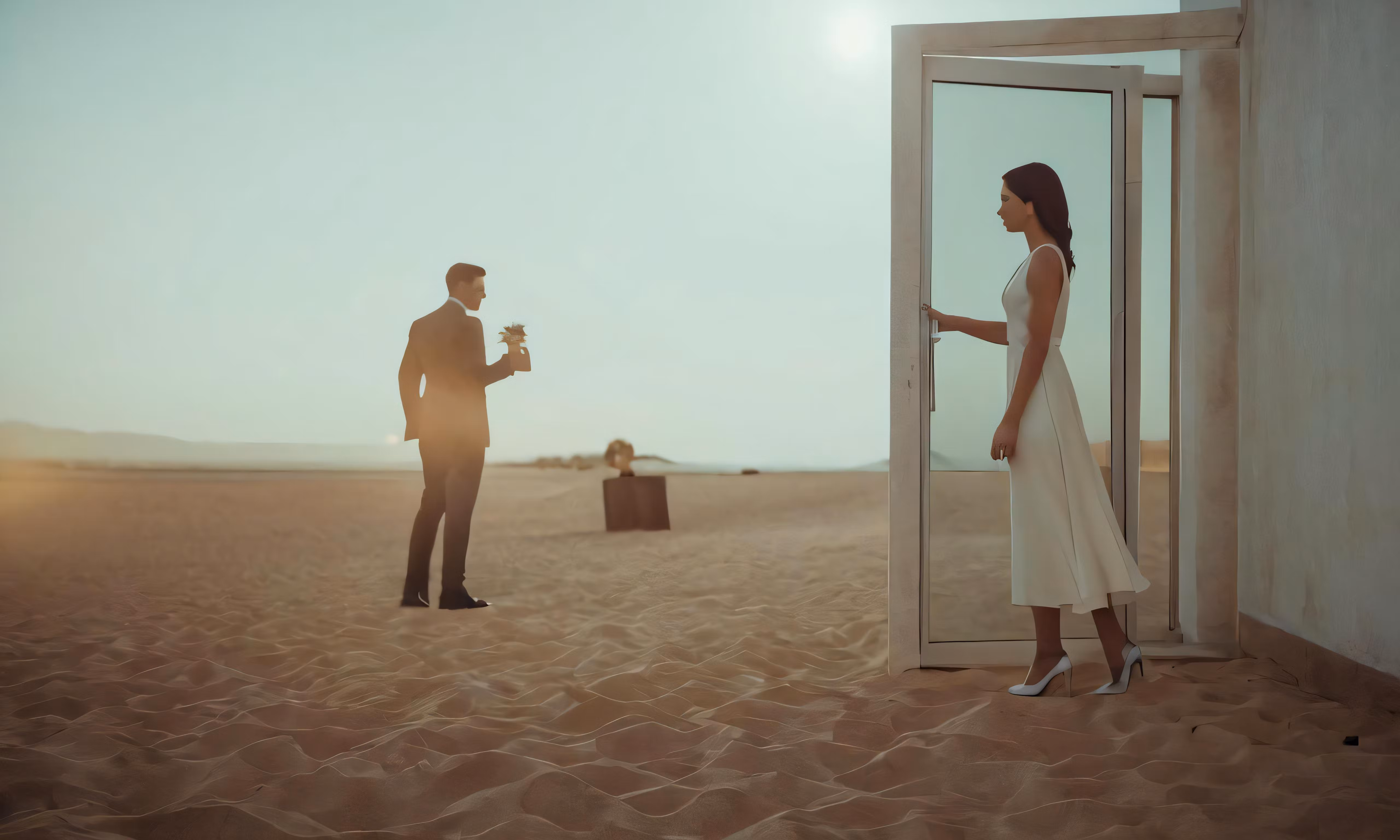 High resolution picture, free to use, a man and woman stand at an open door to the desert