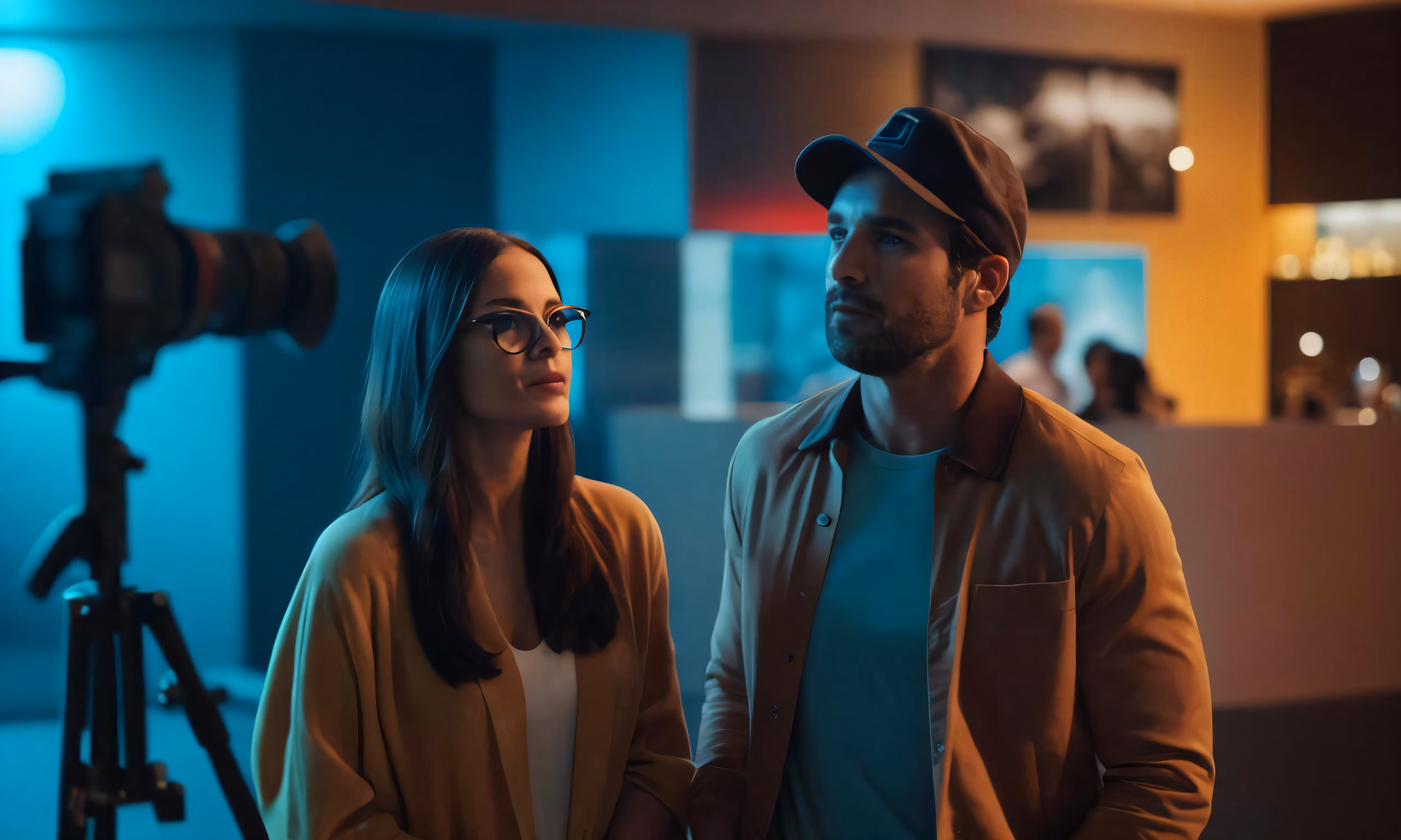 High resolution picture, free to use, a man and woman stand side by side in front of a video camera