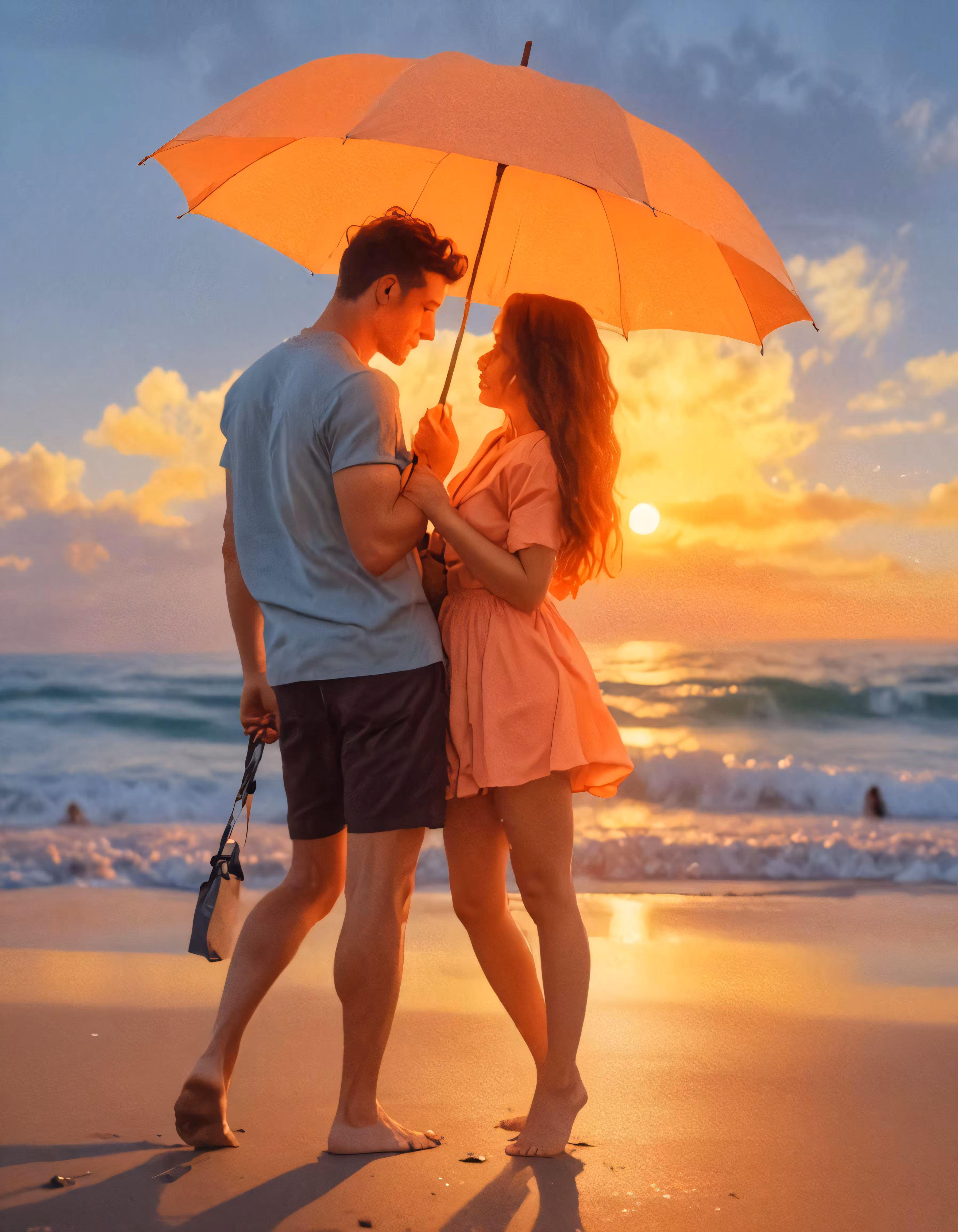 High resolution picture, free to use, a man and woman standing under an umbrella on the beach