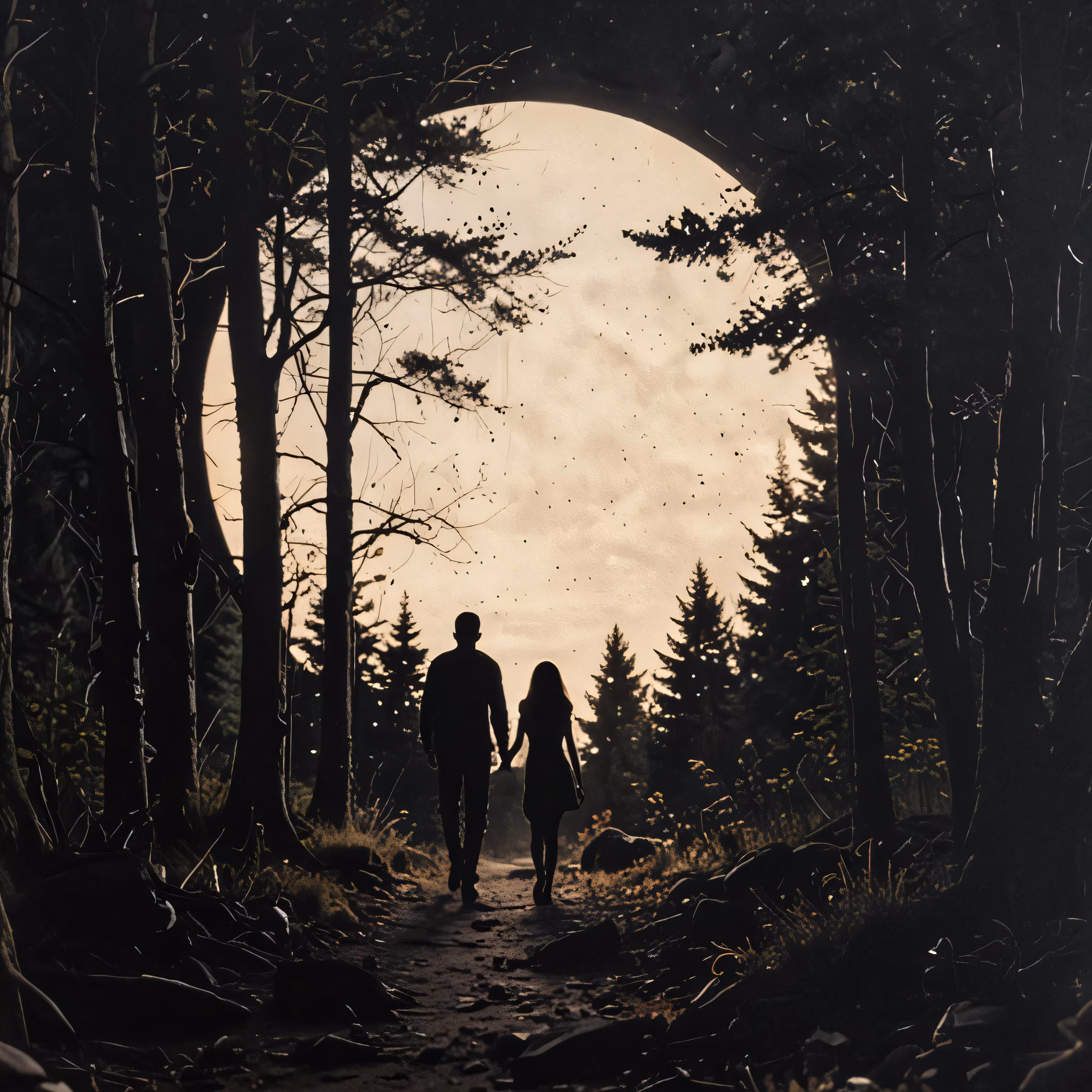 High resolution picture, free to use, a man and woman walk through a forest on a trail under a full moon