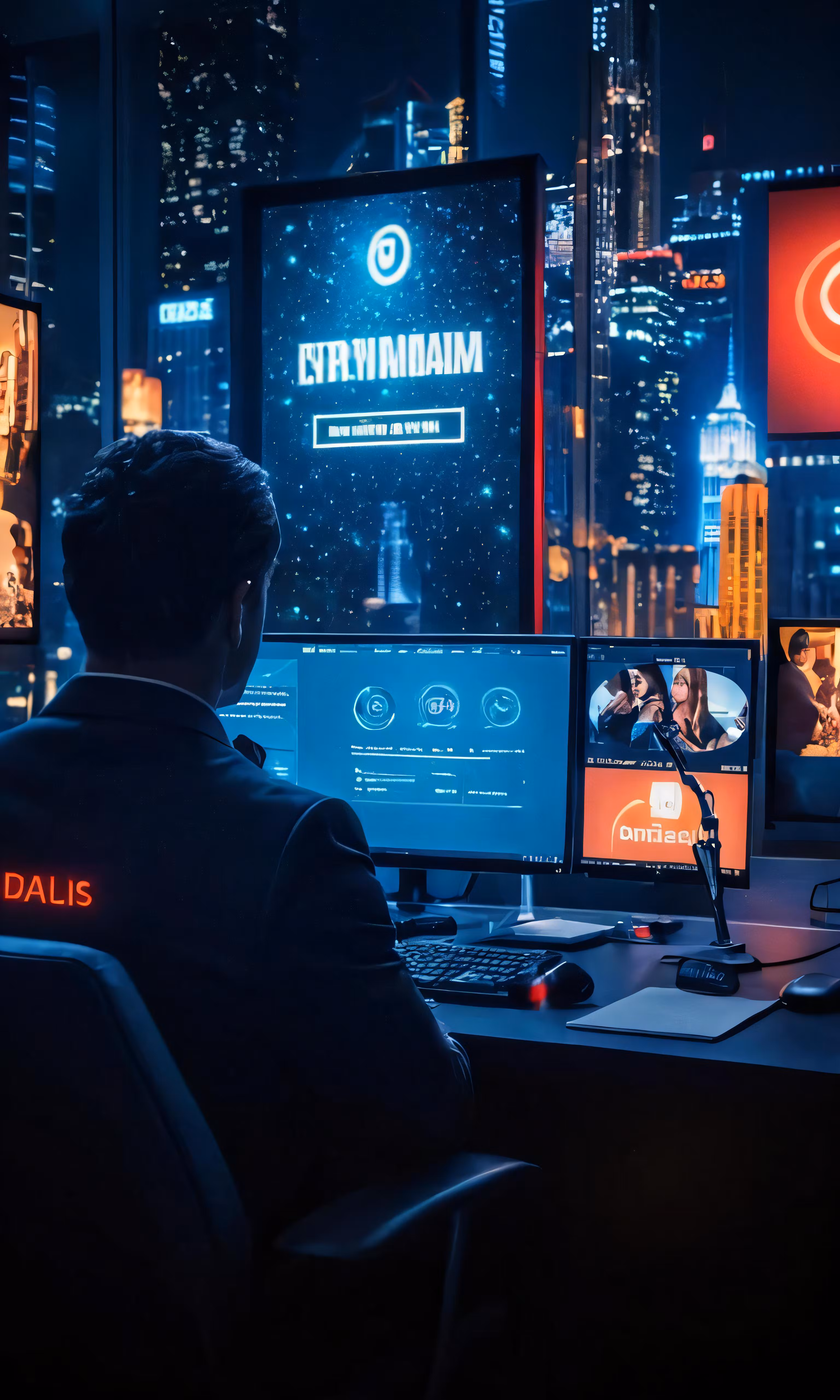 High resolution picture, free to use, a man at a desk with multiple computer monitors