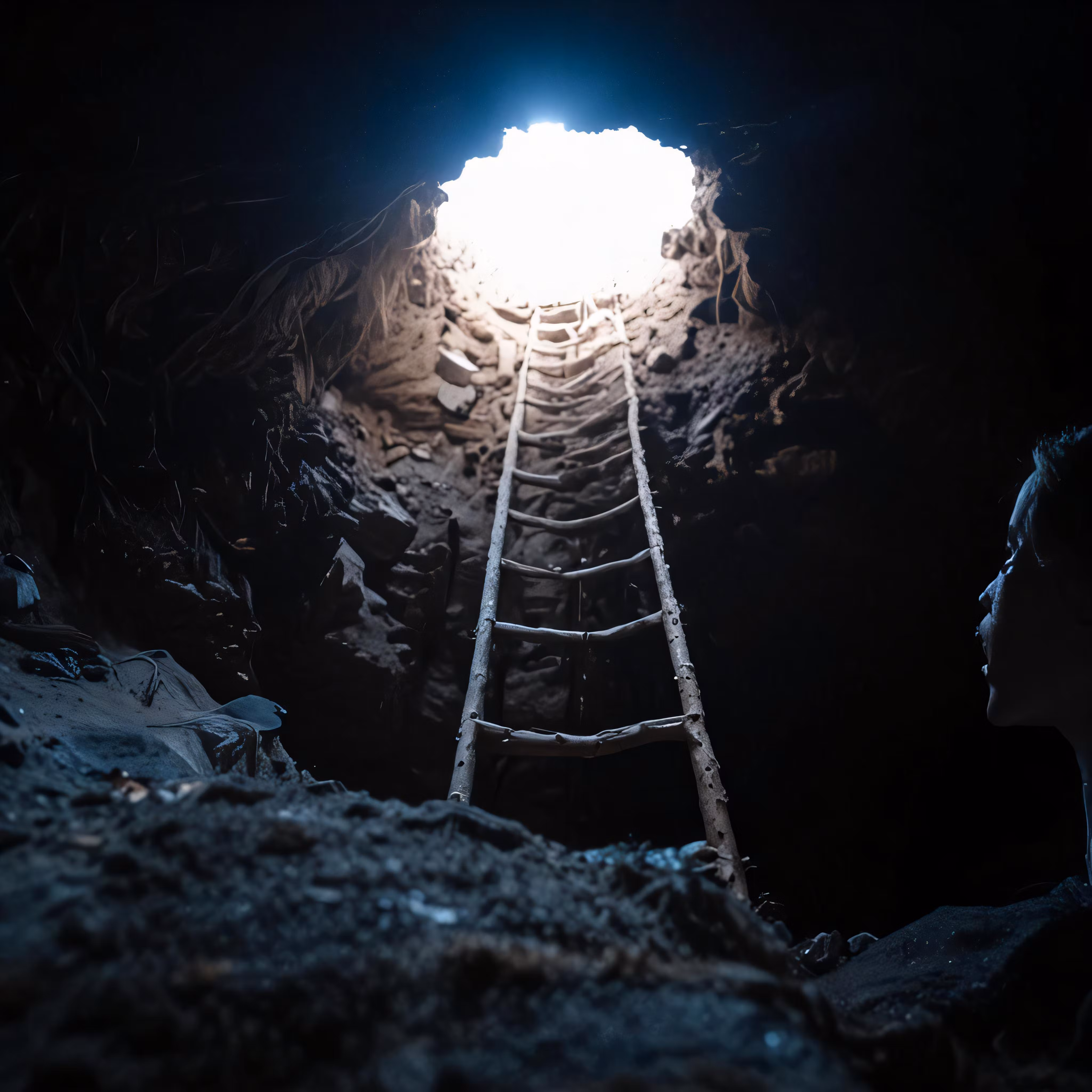 High resolution picture, free to use, a man climbing up a ladder into the light in a cave