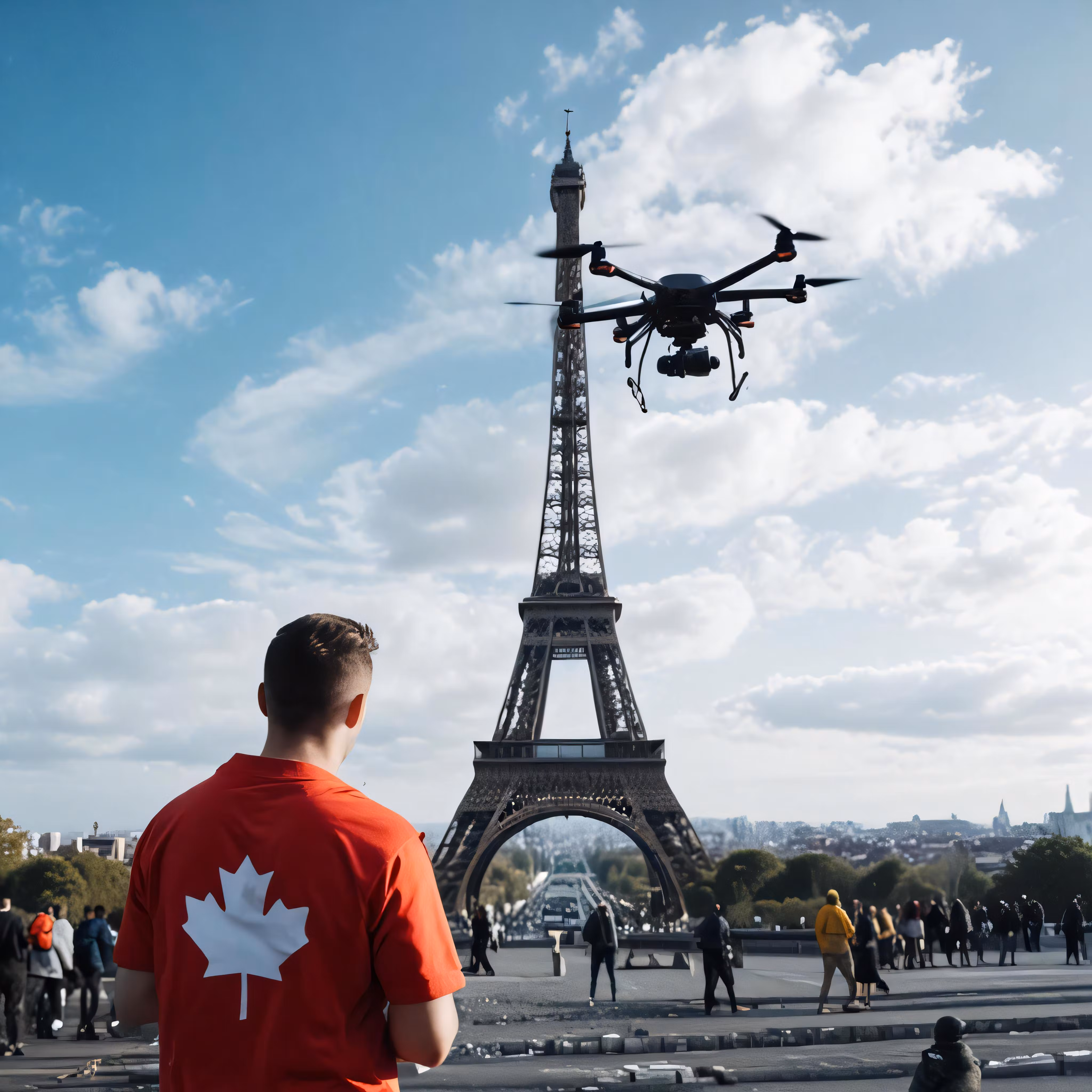 High resolution picture, free to use, a man flying a remote controlled aerial helicopter over a city
