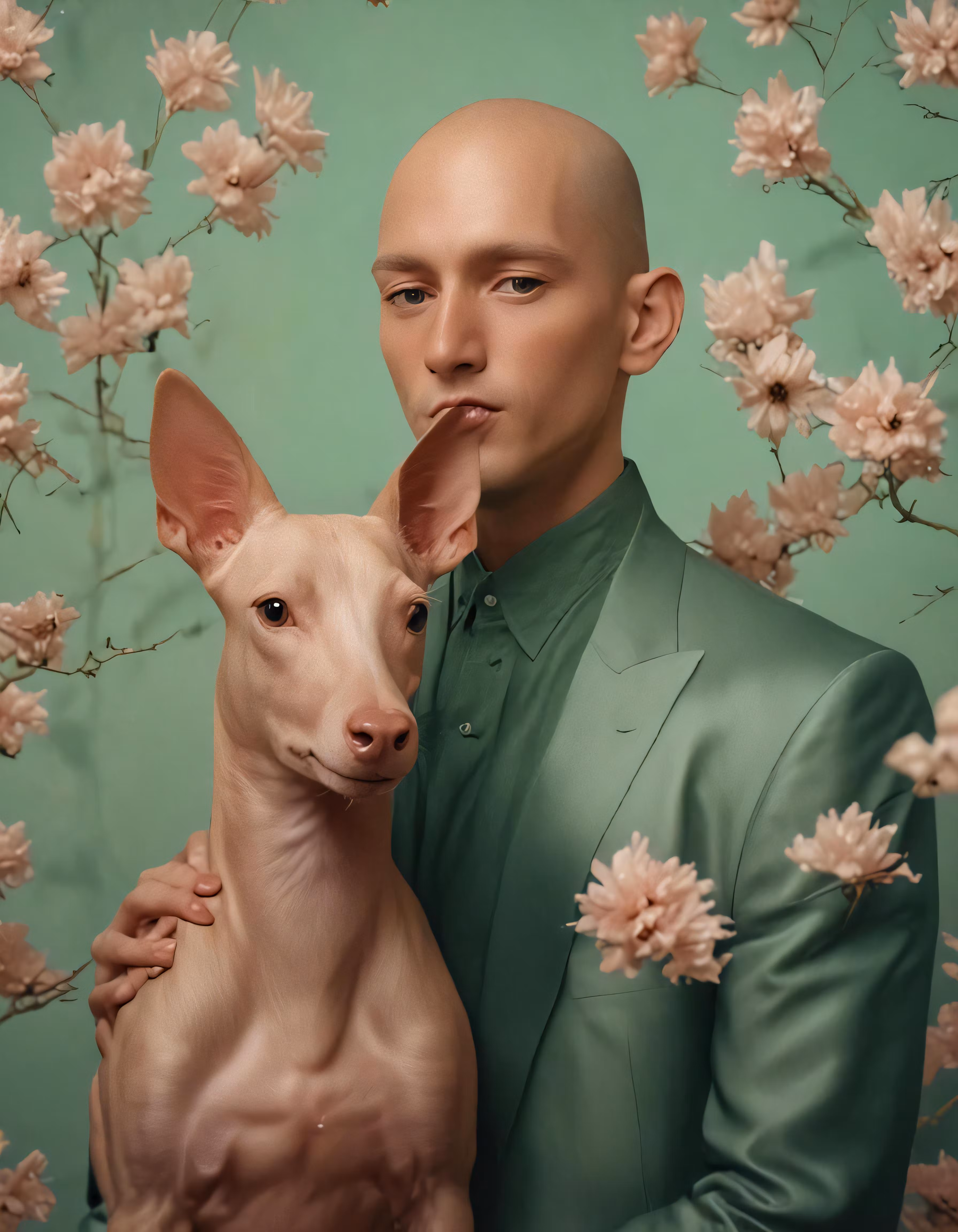 High resolution picture, free to use, a man holding a dog wearing a suit