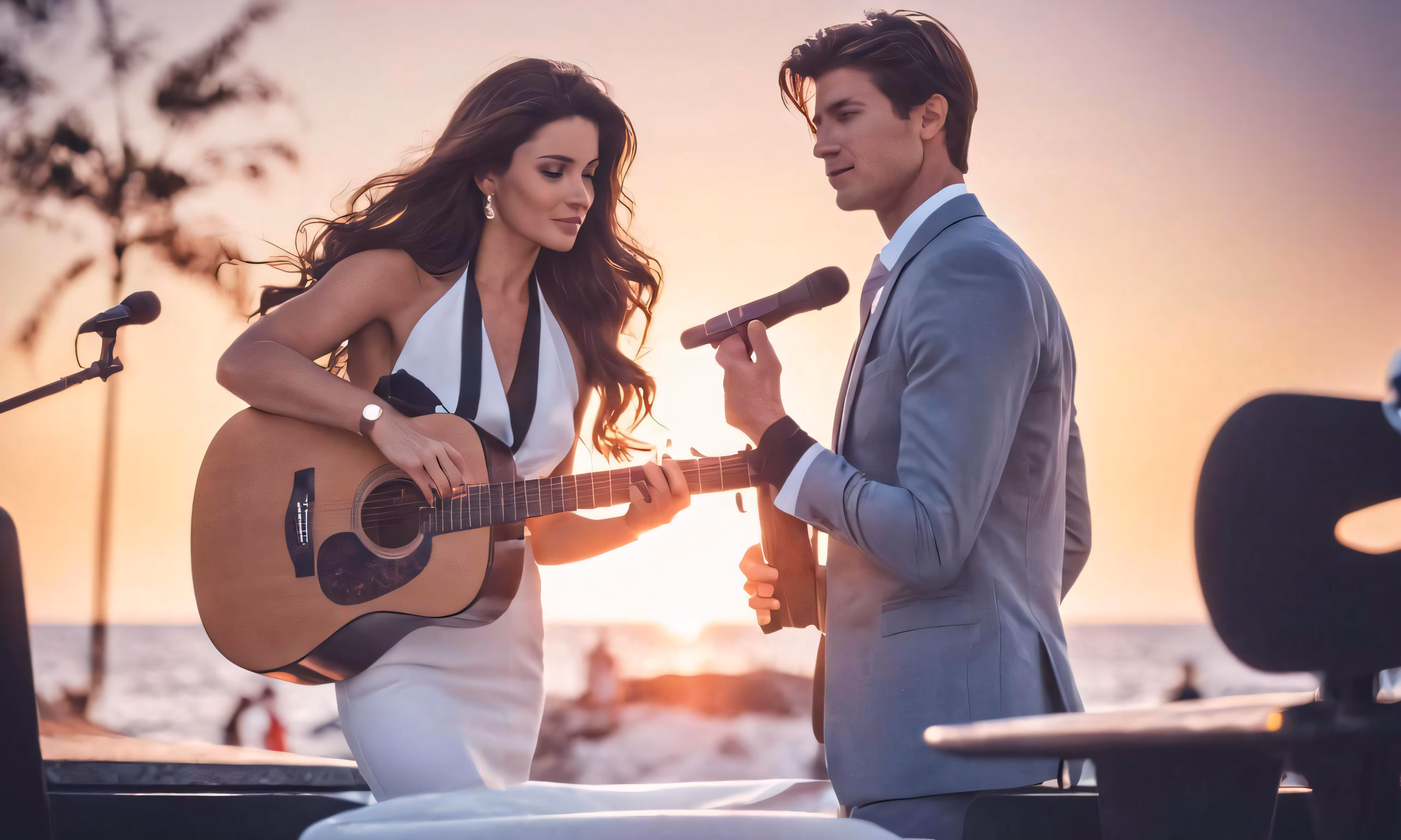 High resolution picture, free to use, a man holding an acoustic guitar next to a woman