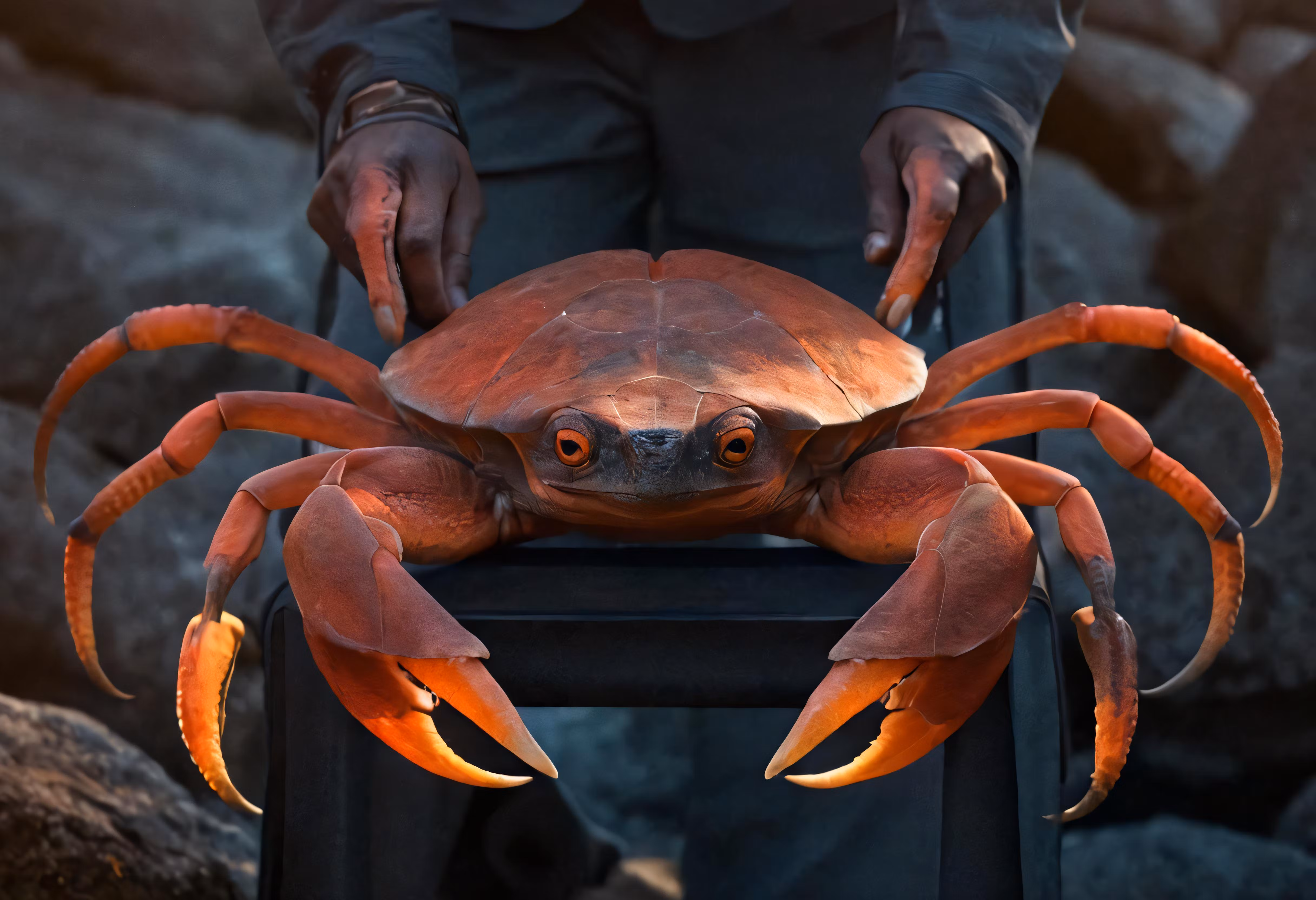 High resolution picture, free to use, a man holding an orange crab with the claws open