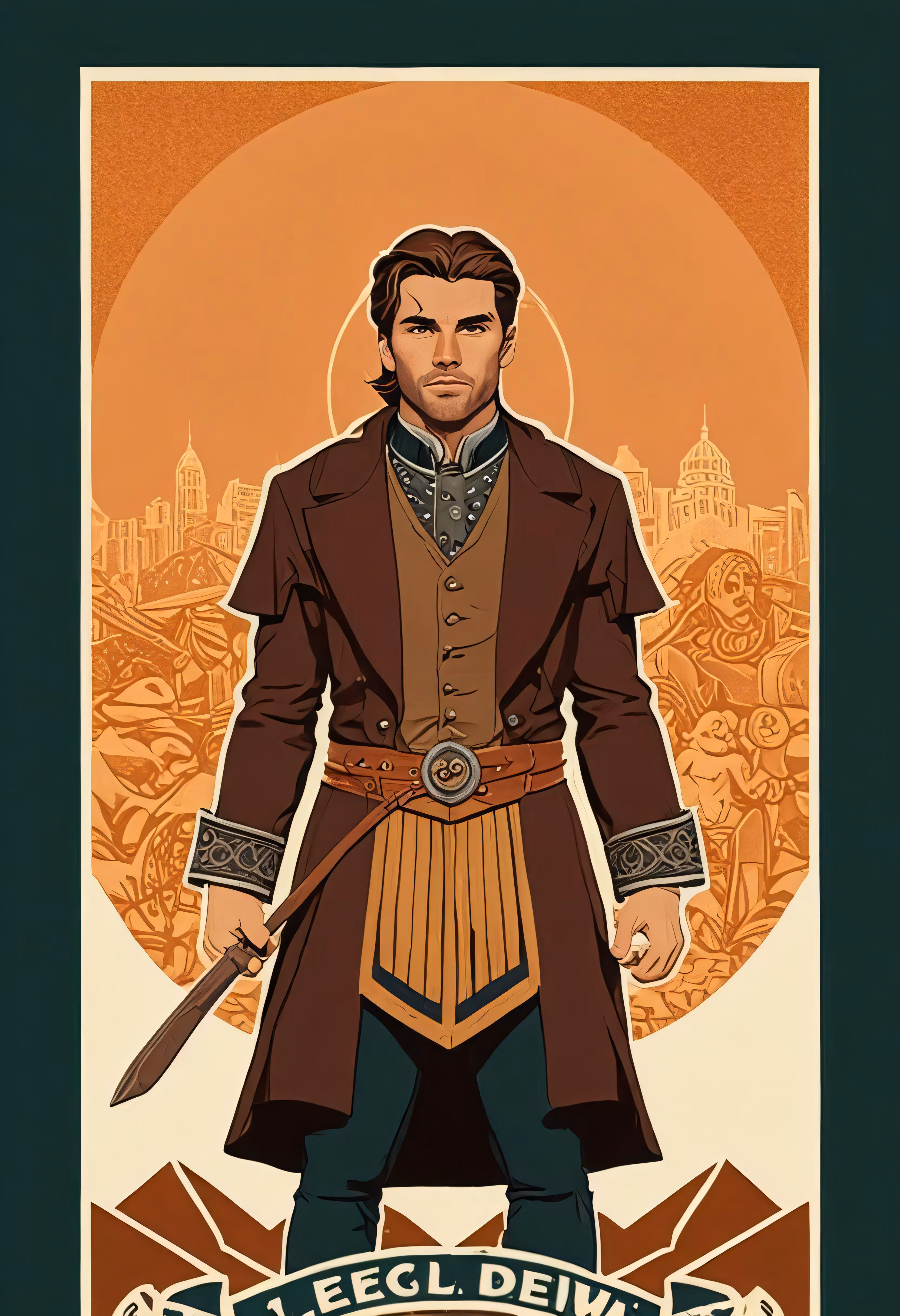 High resolution picture, free to use, a man in a brown jacket holding a sword