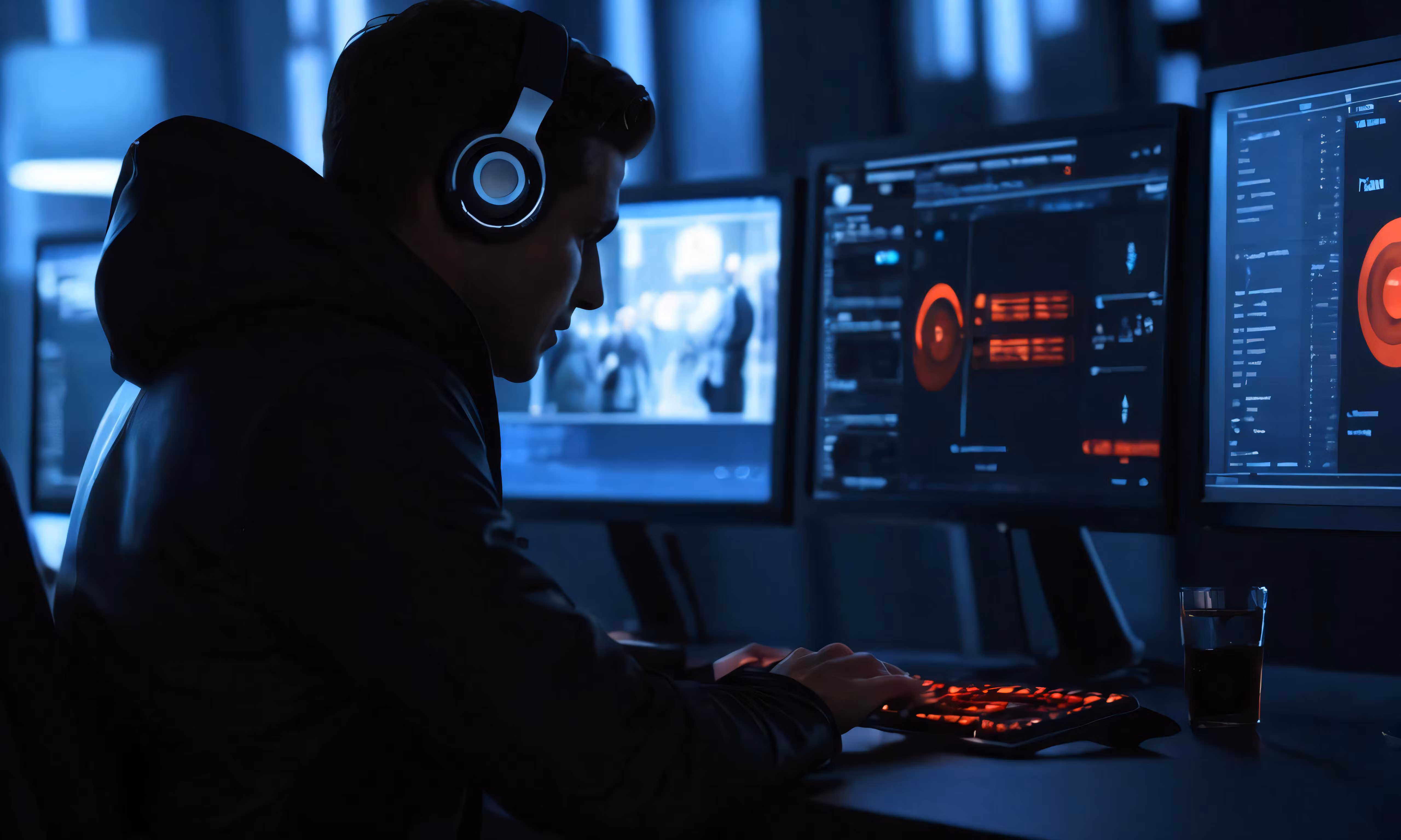 High resolution picture, free to use, a man in a dark room sitting in front of three computer monitors