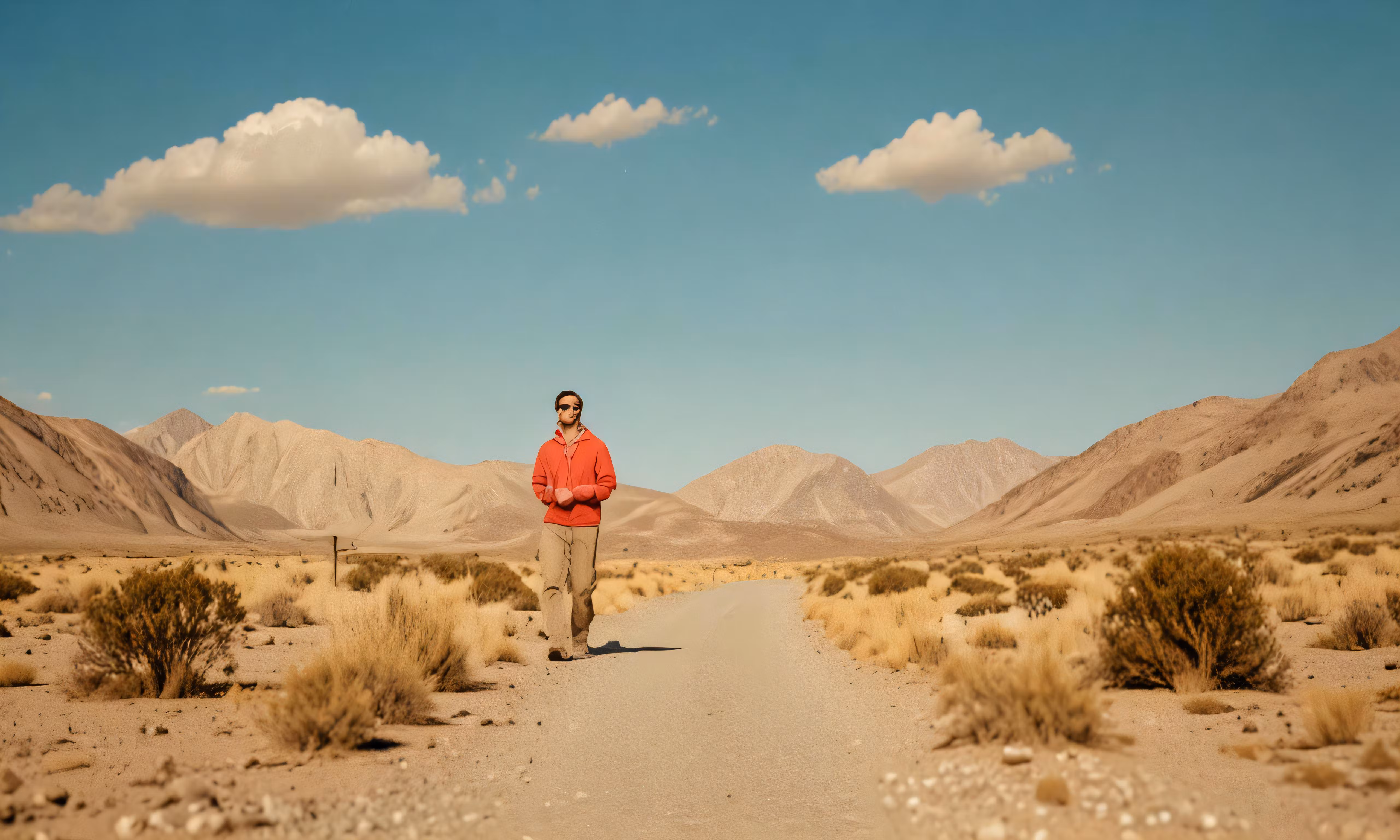 High resolution picture, free to use, a man in a red jacket is walking in the desert