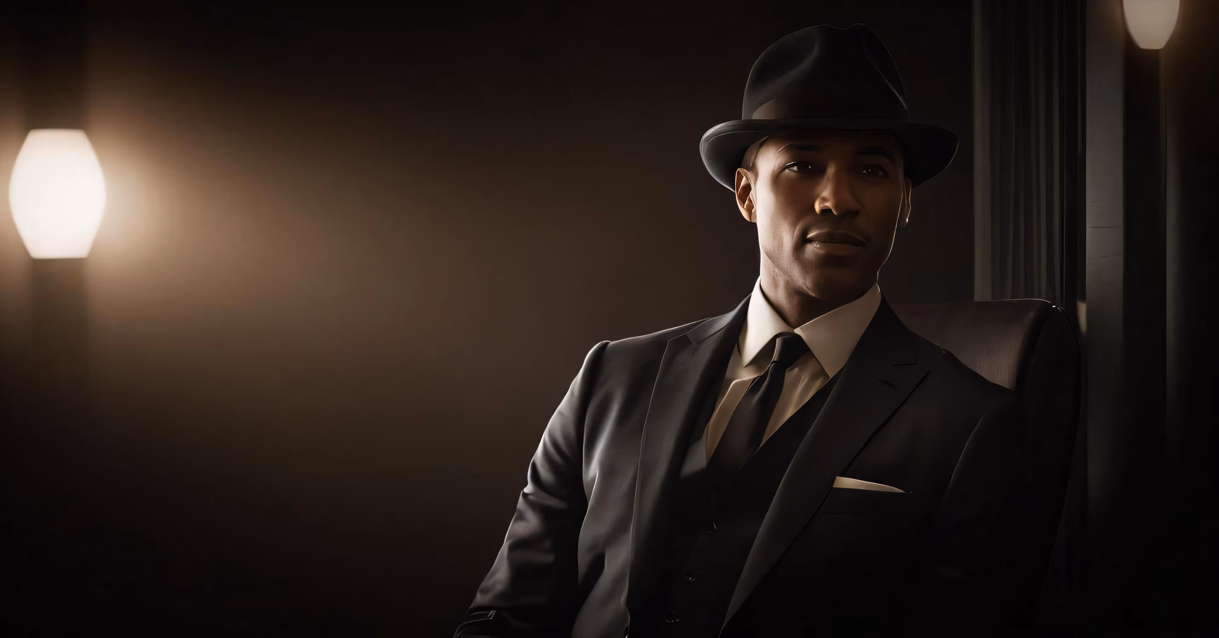High resolution picture, free to use, a man in a suit and hat standing near a lamp
