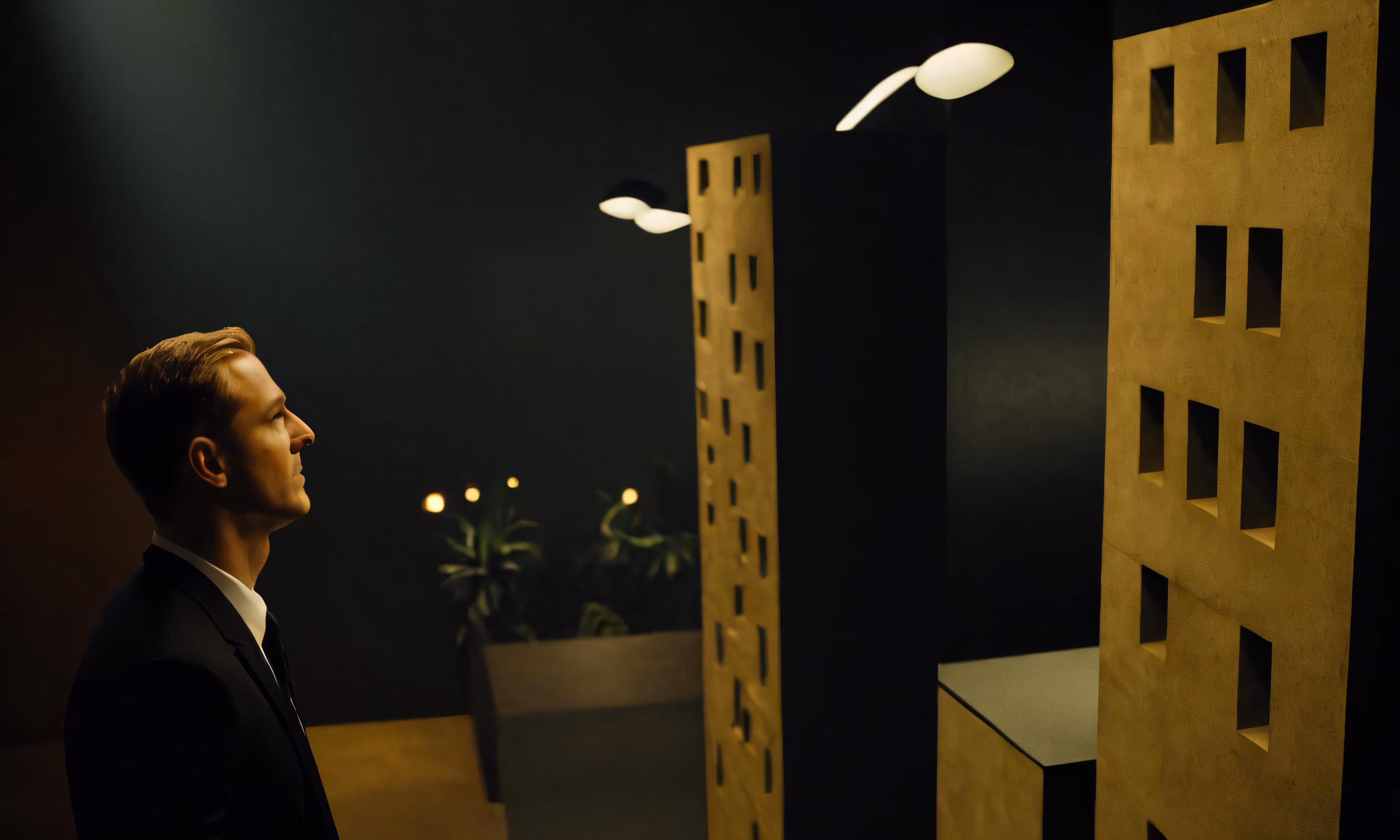 High resolution picture, free to use, a man in a suit is staring at the light on his desk