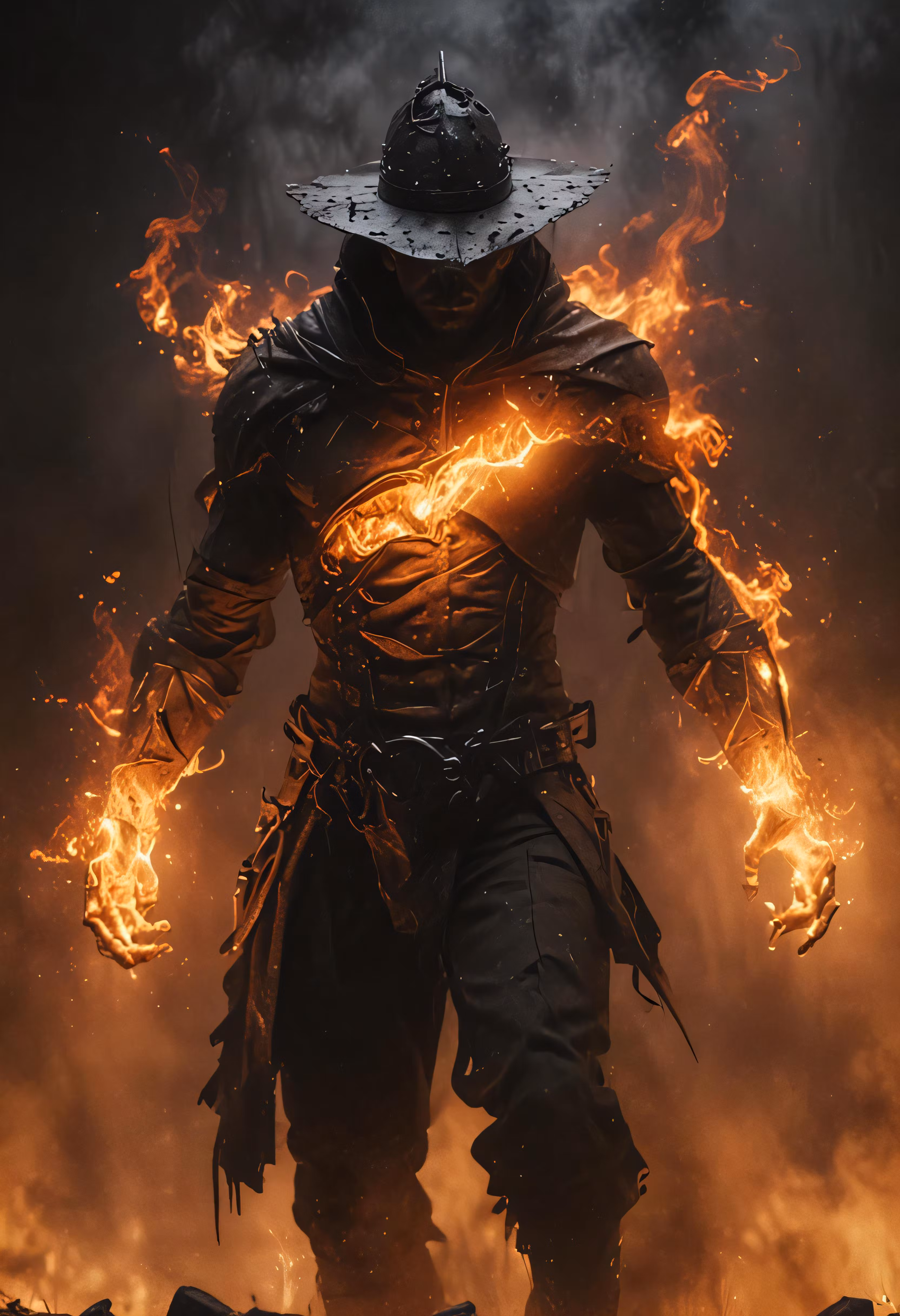 High resolution picture, free to use, a man in a suit is surrounded by fire