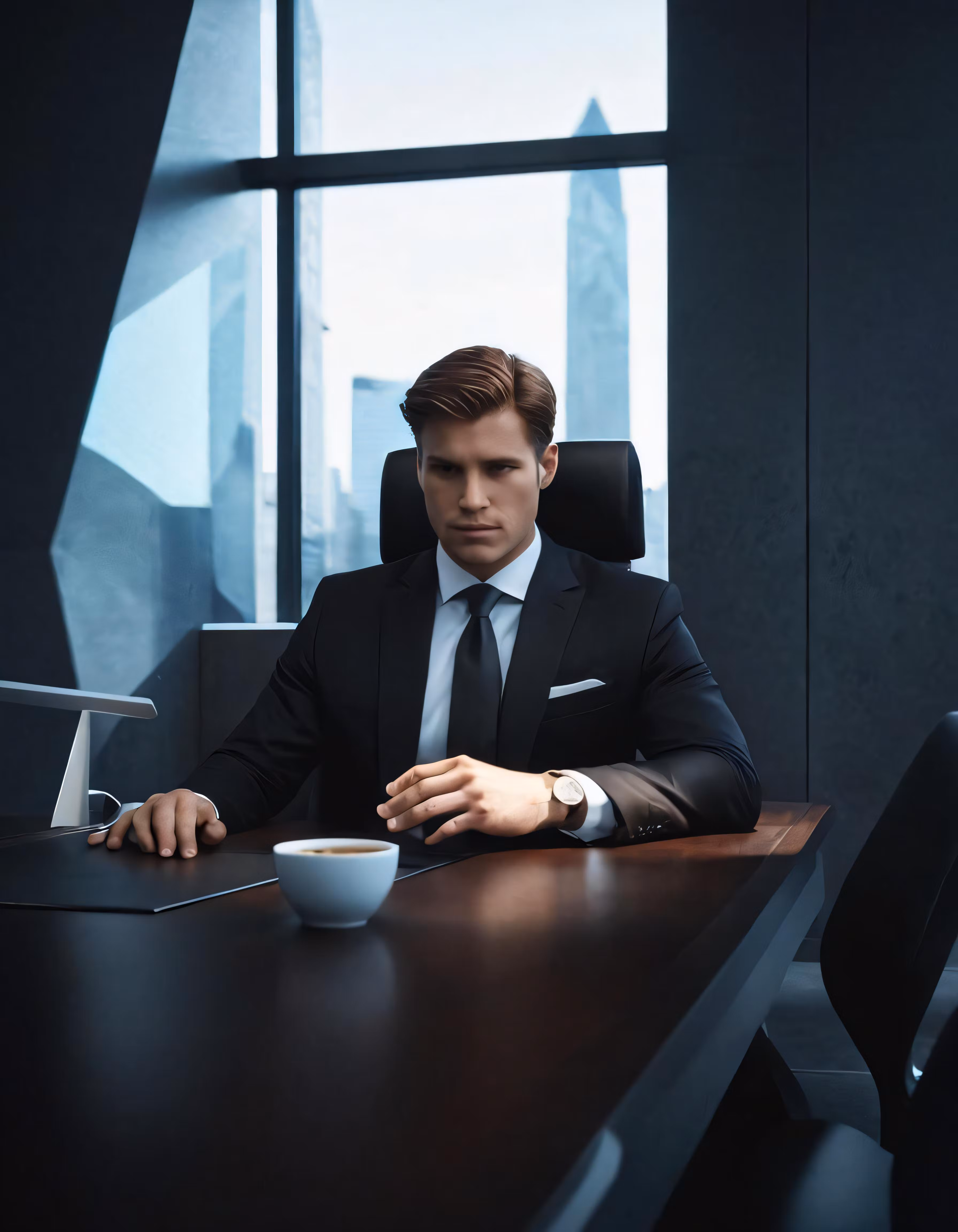 High resolution picture, free to use, a man in a suit sitting at a desk in front of a laptop