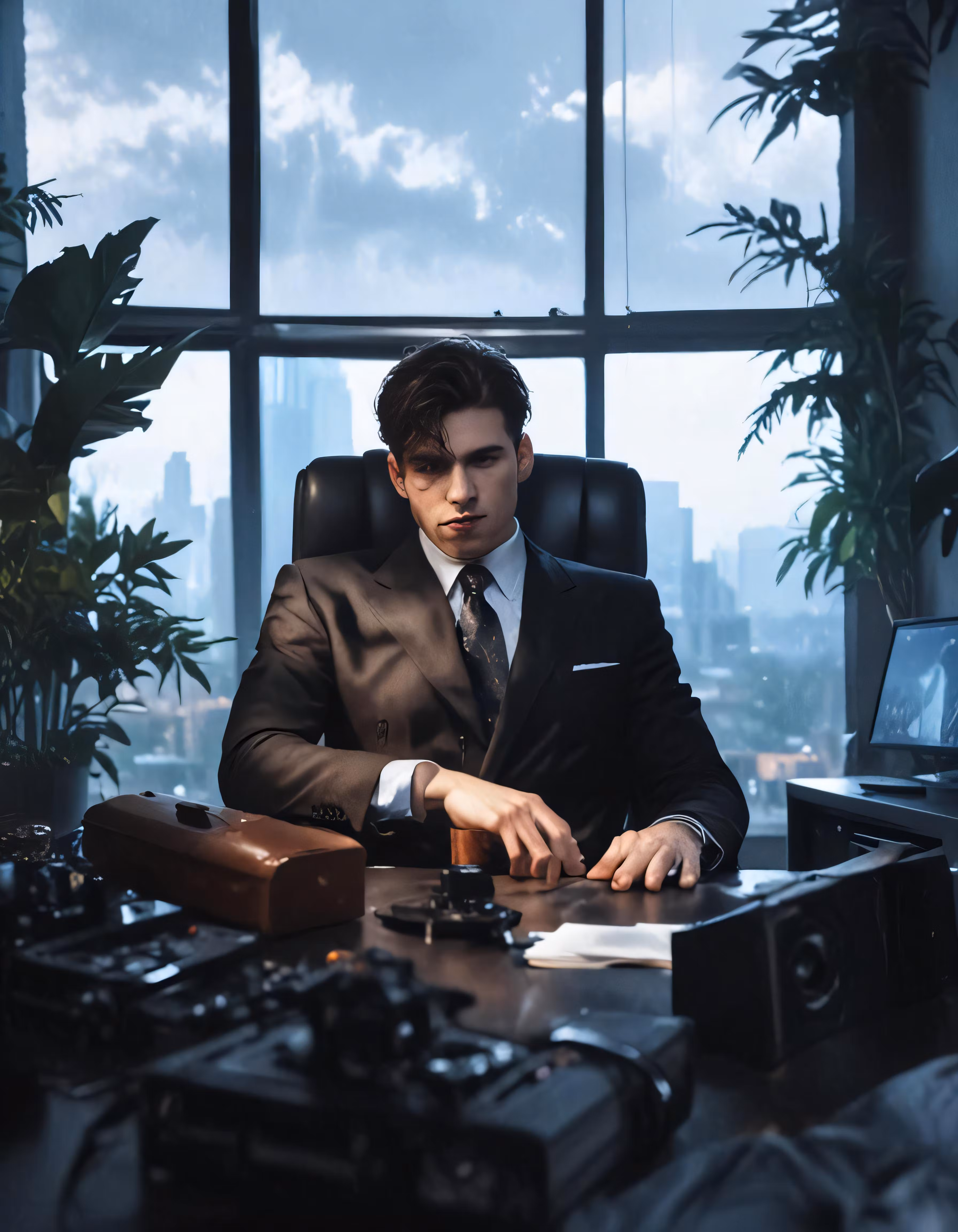 High resolution picture, free to use, a man in a suit sitting at a desk with his laptop