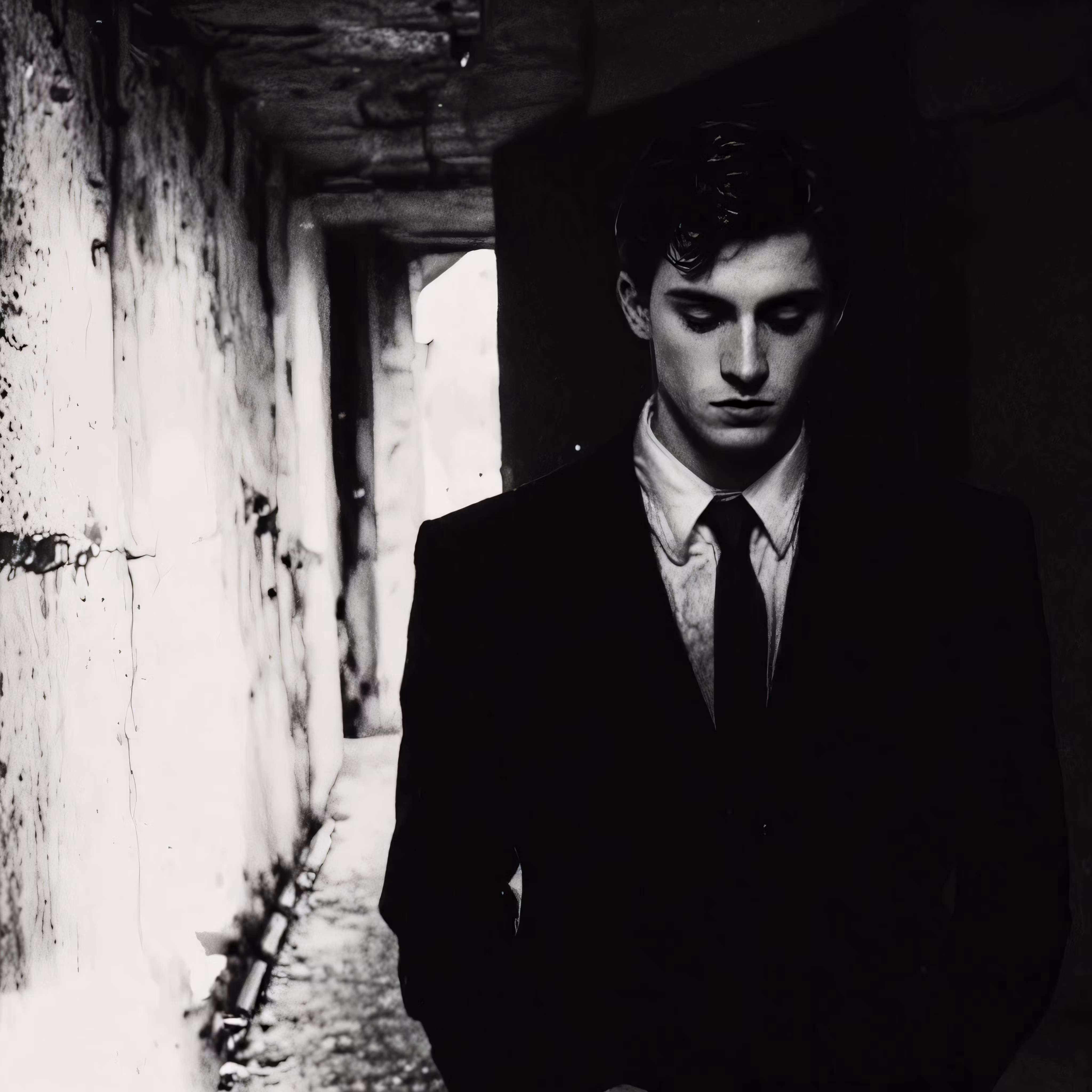 High resolution picture, free to use, a man in a suit stands alone in a dark hallway