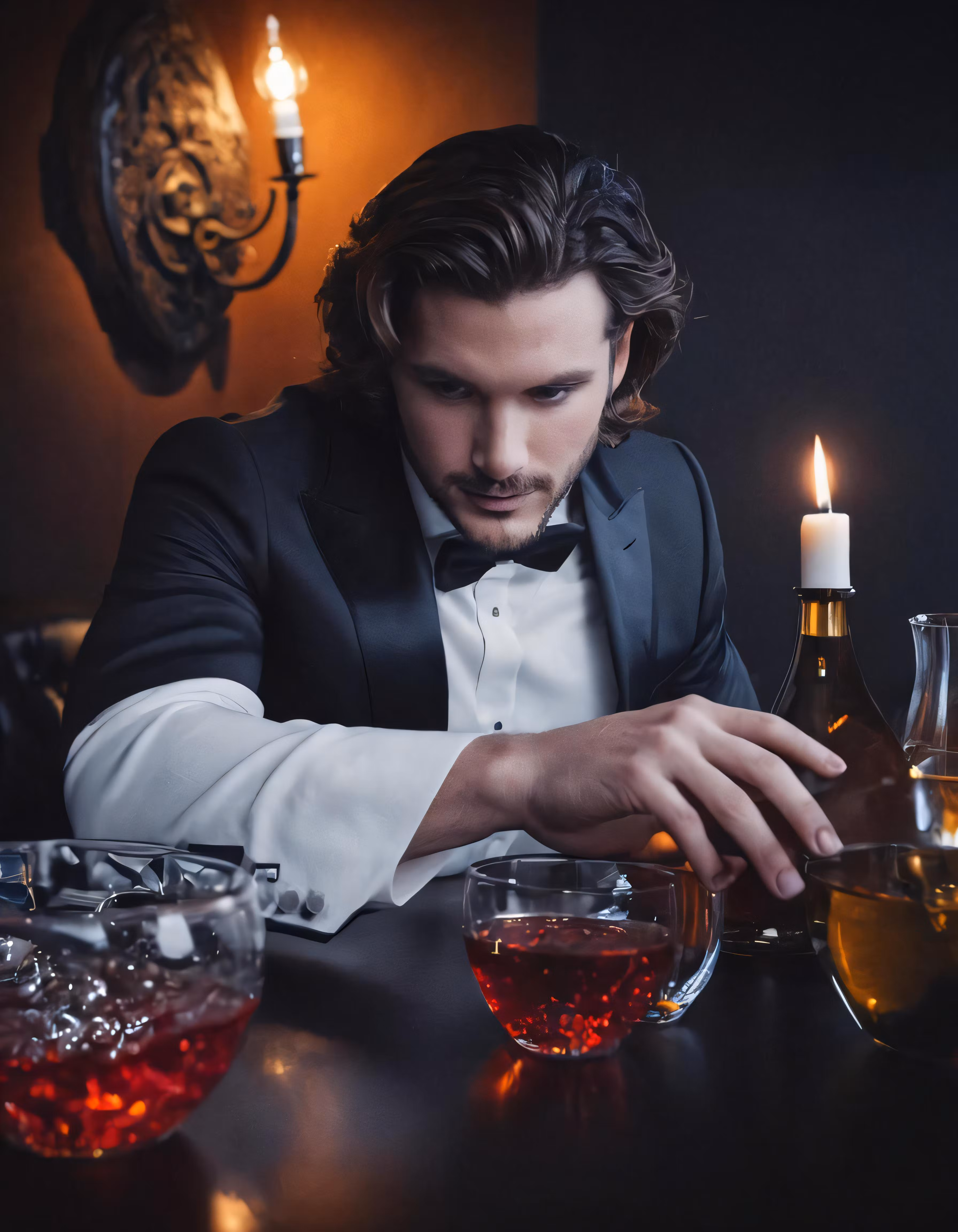 High resolution picture, free to use, a man in a tuxedo sitting at a table with many glasses and wine glasses