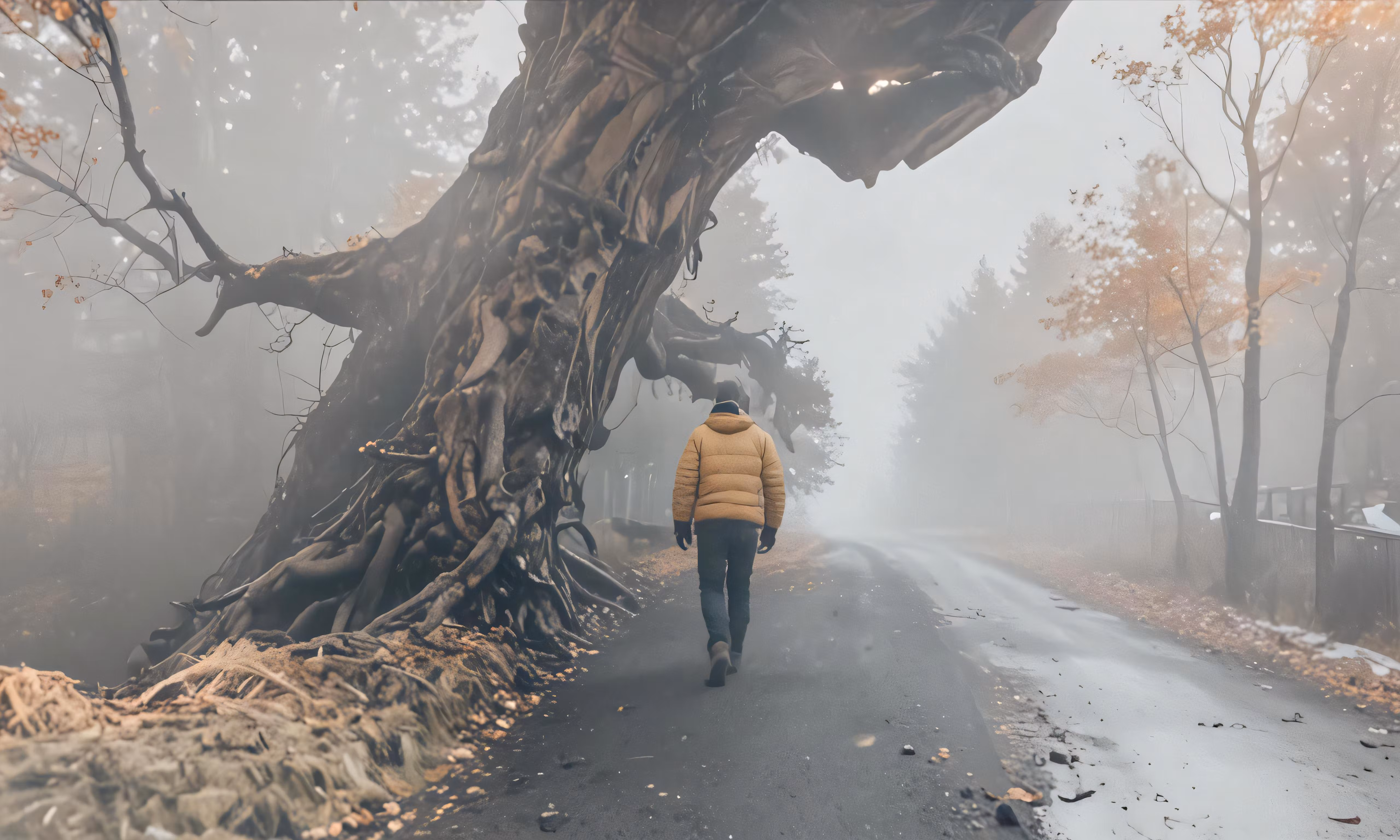 High resolution picture, free to use, a man in a yellow jacket is walking on the road